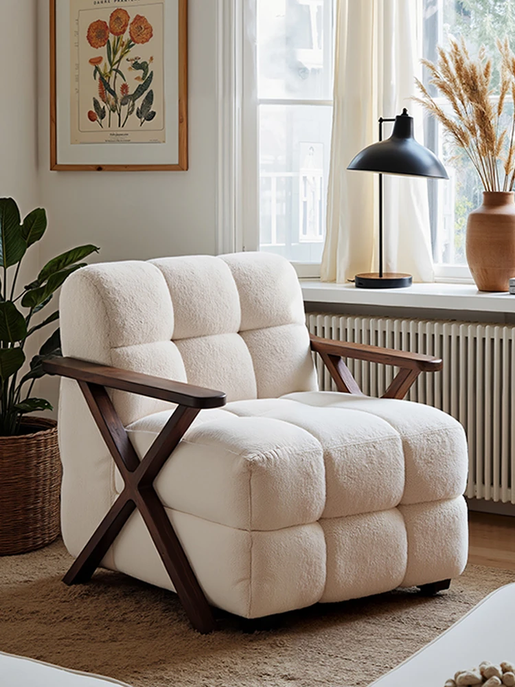 中古のクリーム色風シングルソファー|シンプルでモダンなデザイン|リビングやバルコニーにぴったり|天然木のアームレスト|ふわふわのラムウール素材で快適な休息を!
