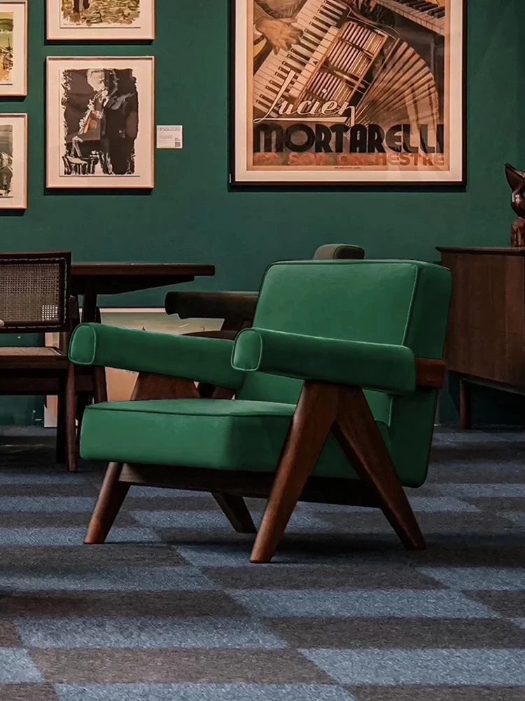 ヴィンテージ風チャンドイガルソファチェア|アメリカンレトロデザインの一人掛けソファ|ホテルや民宿にぴったり!高級感溢れる無垢材使用のリラックスチェアで、心地よいひとときをお楽しみください。