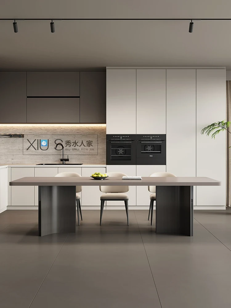 2025年新作!ベーカーテーブル ステンレス製 下掛け全托底板 岩板デザインのダイニングテーブル - モダンでミニマルな軽奢スタイルの家庭用テーブル。洗練された美しさで、食卓を華やかに演出!