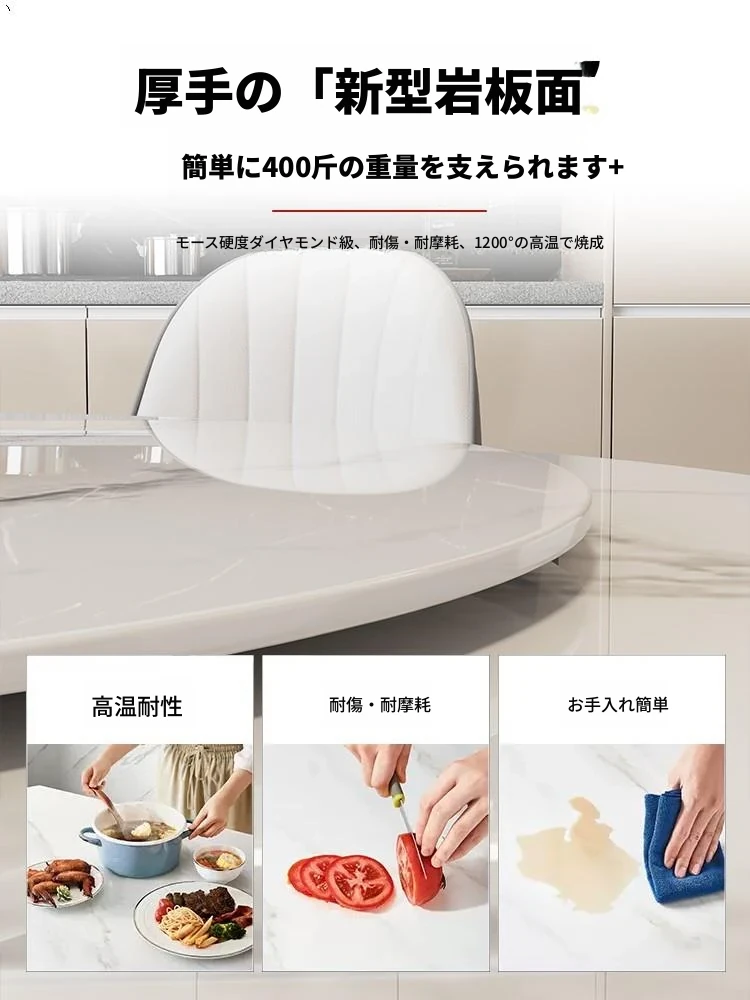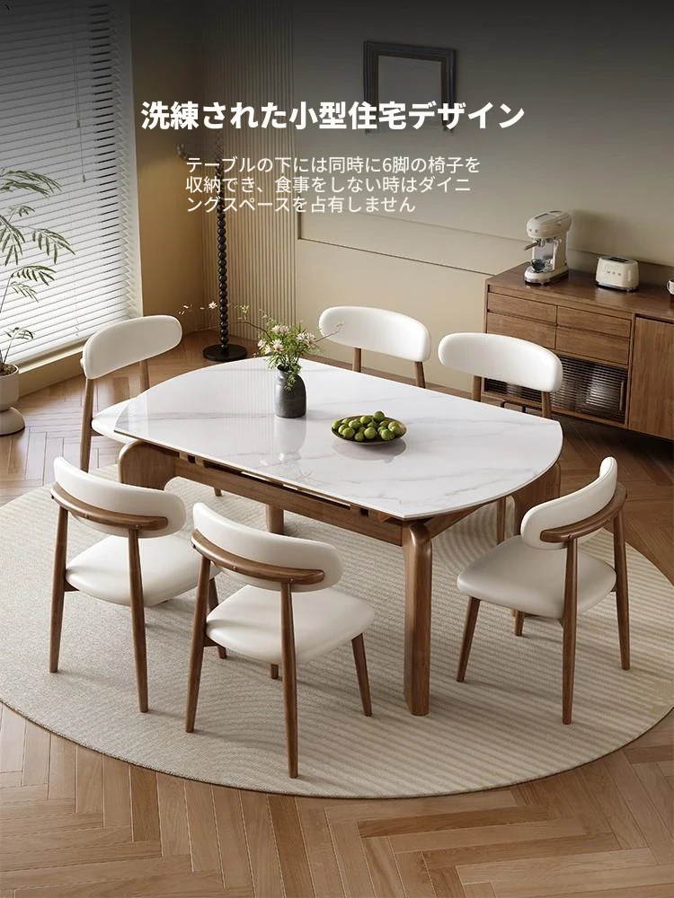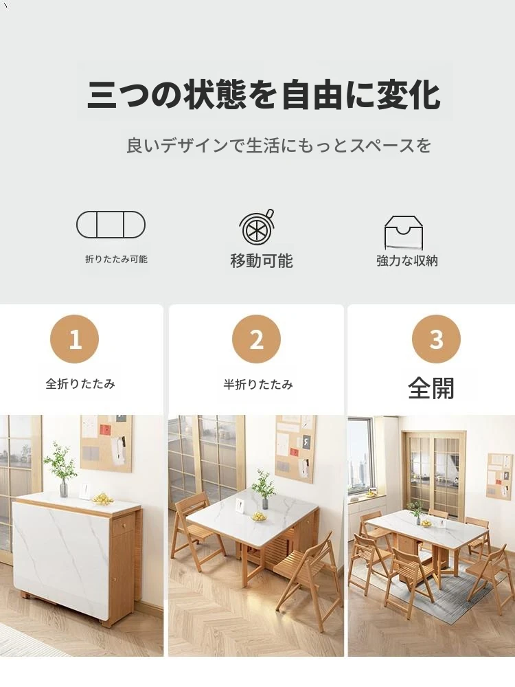 おしゃれで機能的な折りたたみ式岩板ダイニングテーブルセット!狭いスペースにもぴったりな現代的デザイン、伸縮可能で収納もラクラク。全てが無垢材で作られており、家族団欒のひとときを演出します。