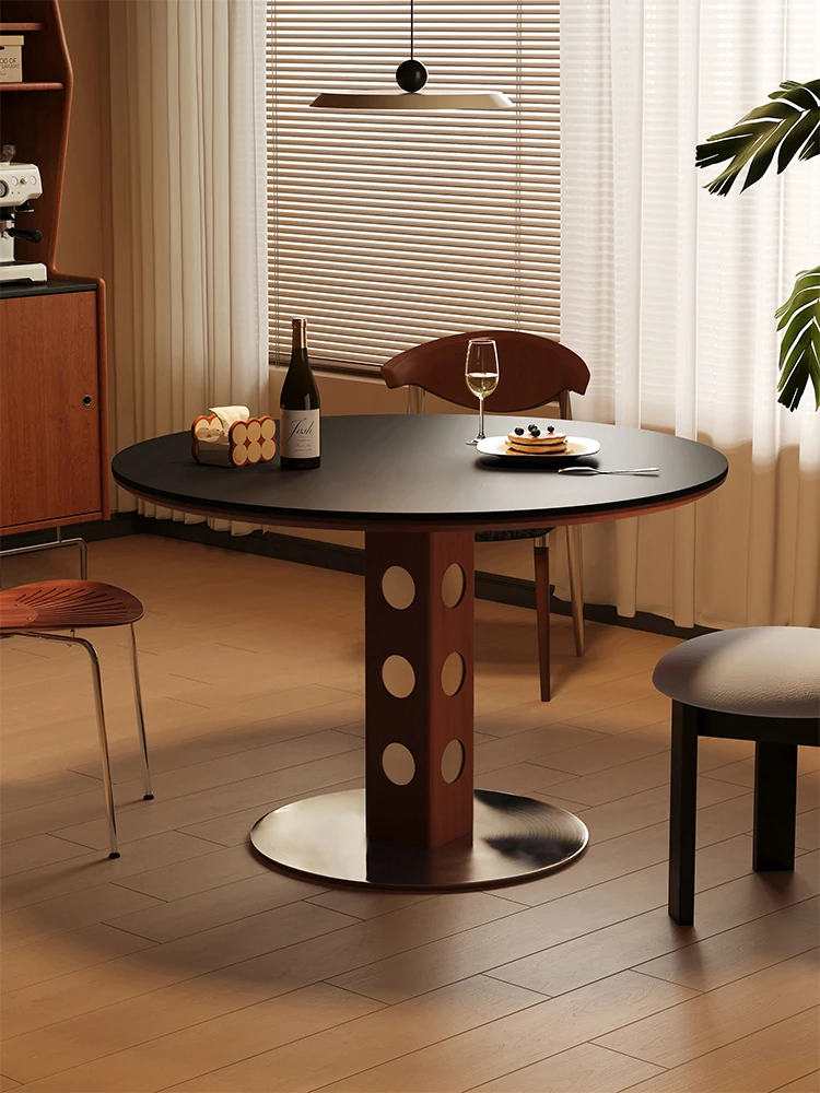 宥希家具2025新作!おしゃれな丸型天然木製ロックボードダイニングテーブル。小さなお部屋にもぴったりな家庭用・リビング・打ち合わせに最適なデザイン!