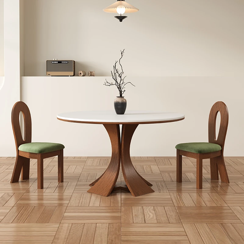 フランス風ヴィンテージ円形岩板ダイニングテーブルセット - 小スペースに最適なシンプルなホワイトアッシュ無垢材製。おしゃれで機能的な食卓で、家族や友人との素敵な食事タイムを演出します!
