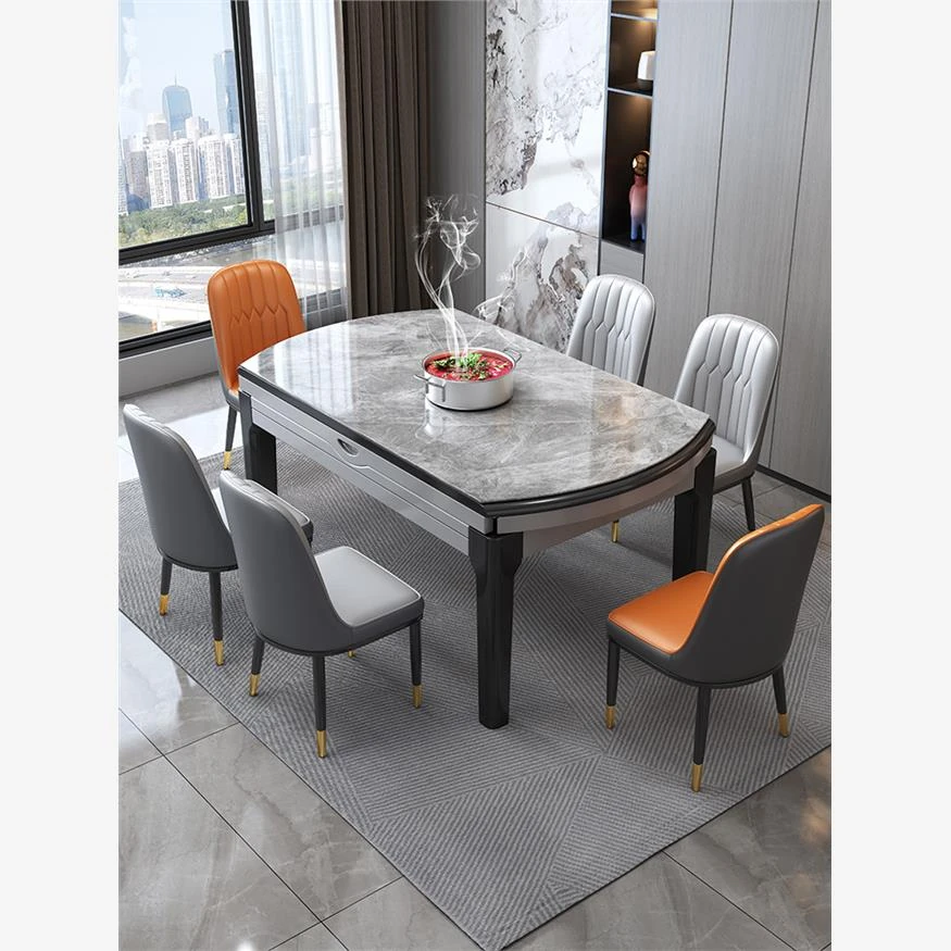 モダンシンプルな岩板ダイニングテーブル - 小型住宅向け、内蔵型電磁調理器、温かい料理を楽しむ回転プレート付き、伸縮式の無垢材テーブルです。おしゃれで機能的な食卓を手に入れましょう!