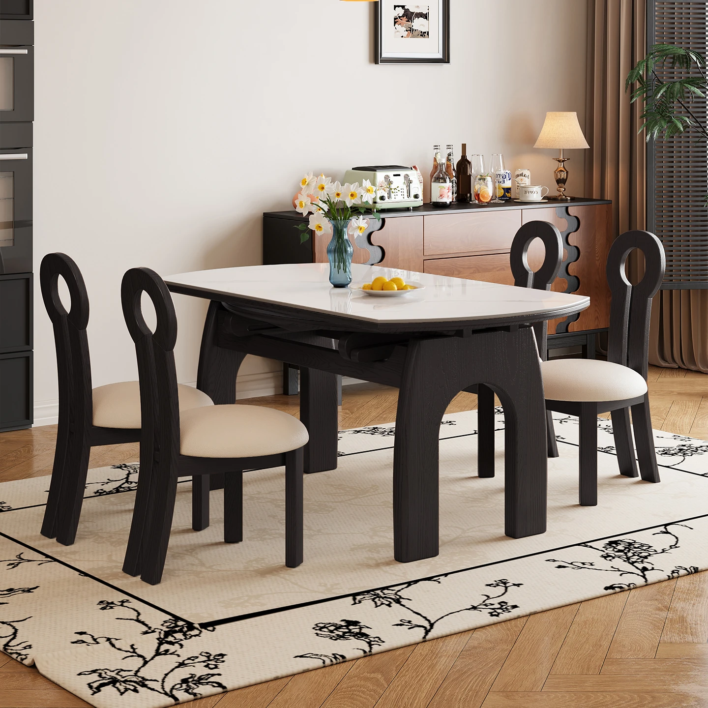 2025年新作!フレンチヴィンテージスタイルの無垢材ダイニングテーブル&チェアセット - 黒い石板とクリーム色のアメリカンアンティーク風デザインが魅力的な和風リビングにぴったり!