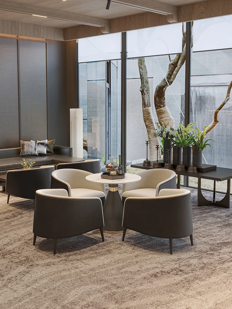 ラグジュアリーな雰囲気の不動産販売用談話テーブル&チェアセット|ホテルの商談やカフェの休憩エリアに最適!一卓四椅子で、ゆったりとした会話を楽しめる高級感あふれるデザイン。