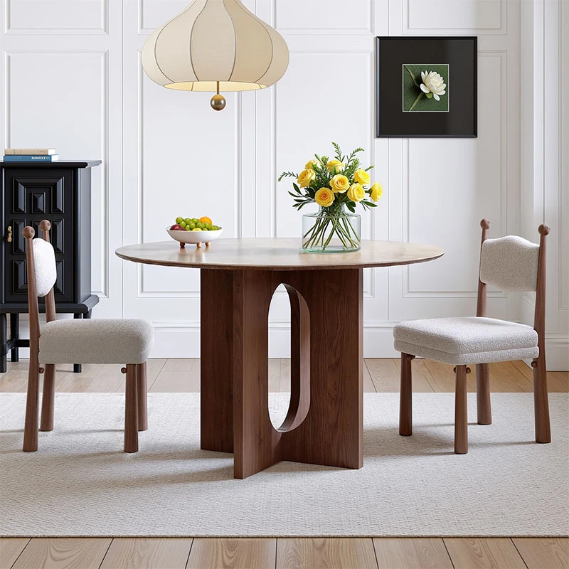 洞石岩板の丸テーブル - 小型住宅にぴったりな中世風デザインのラウンドダイニングテーブル。郁金香スタイルの椅子とのコンビネーションで、優雅な食事空間を演出します!