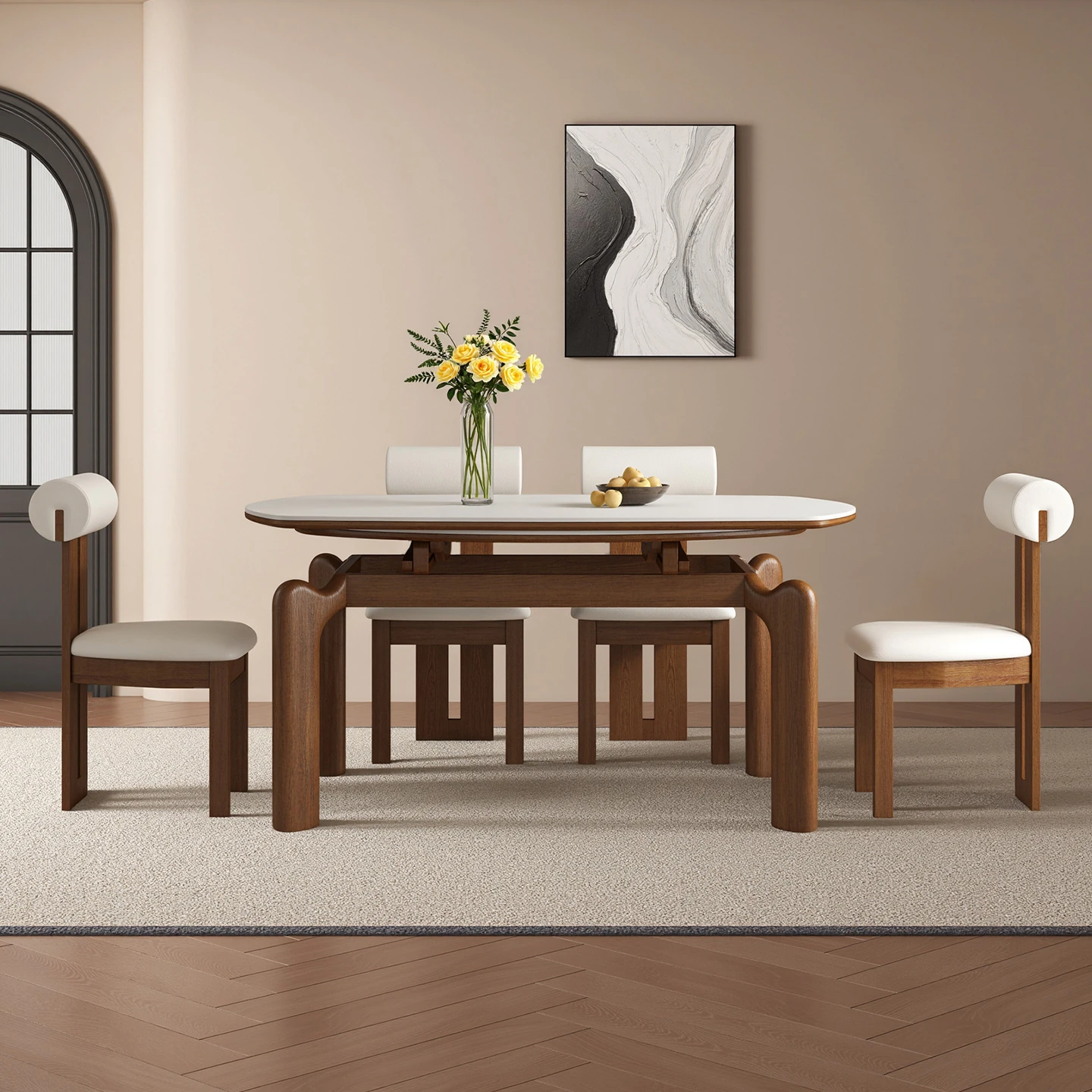 フレンチヴィンテージ風 折りたたみ式無垢材使用のロッククォーツ ダイニングテーブルセット 小型スペースに最適!伸縮可能で四角から丸型に変形、食事の時間を特別に演出します。