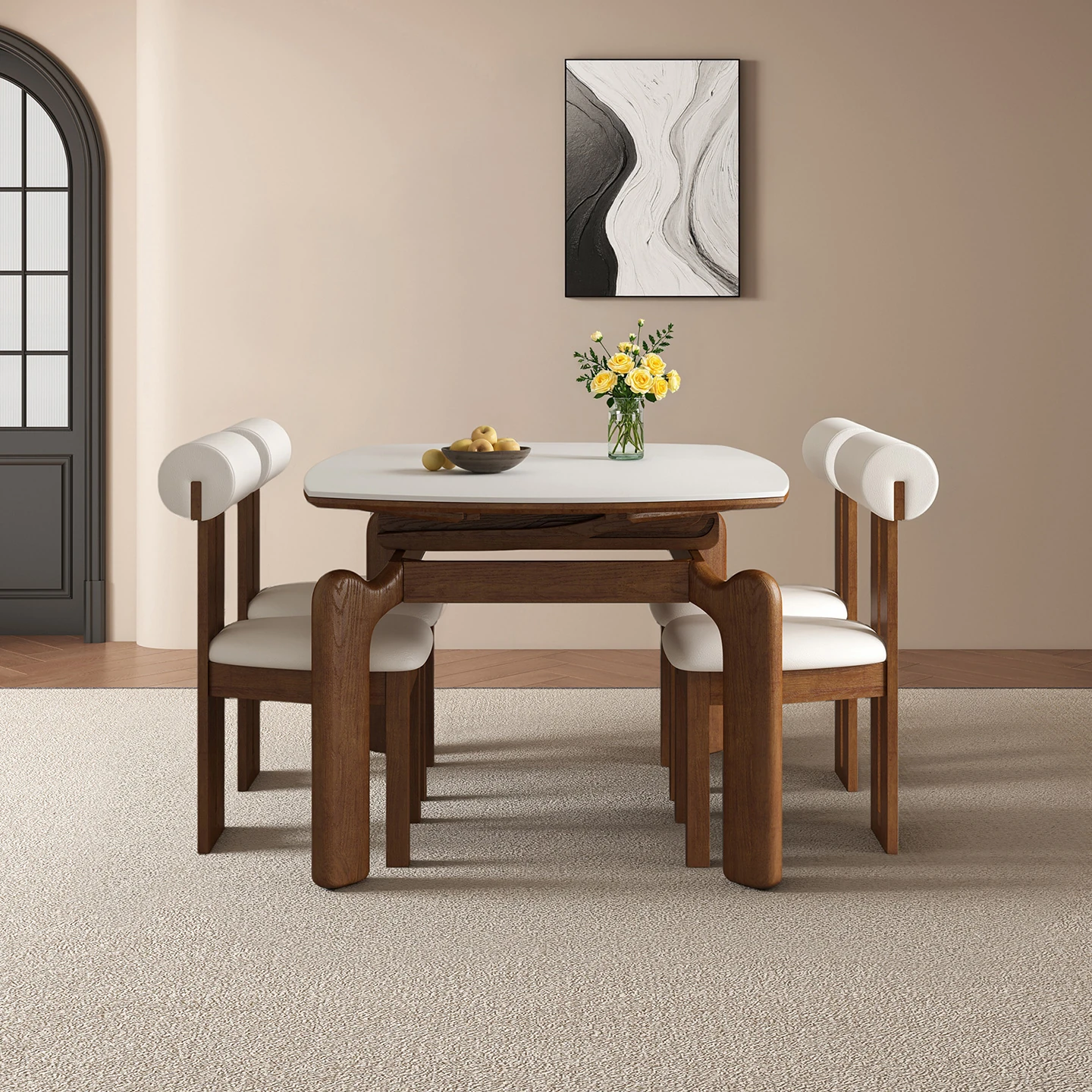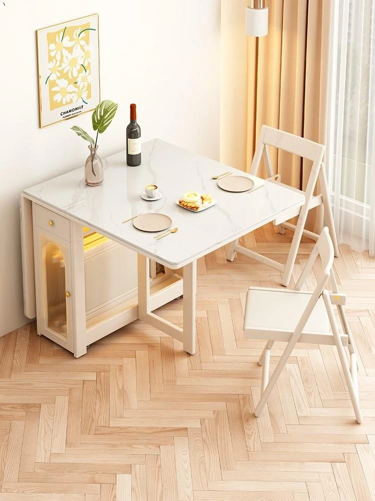 クリーム風折りたたみ岩板ダイニングテーブル&チェアセット - シンプルでスタイリッシュな白色、家庭に最適!多機能で移動可能な無垢材製の食卓で、毎日の食事を特別な時間に演出します。
