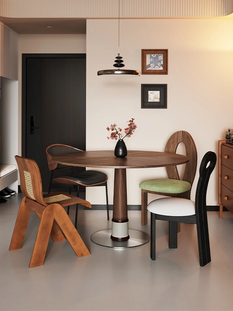 ヴィンテージ風のラウンドダイニングテーブルとチェアセット - 和の美しさを感じる侘寂スタイル、贅沢な天然木製、小さなスペースにもぴったりのモダンミニマリストデザイン!