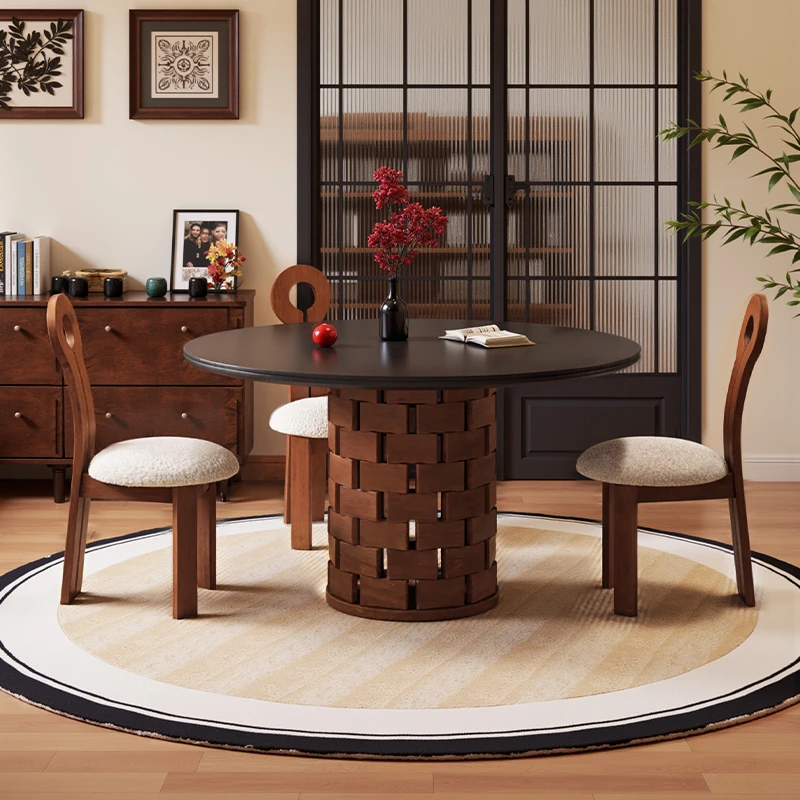 フレンチアンティークスタイルのブラックストーンテーブルセット - デザイナー新作!家庭用のブロック型円形テーブル、レトロな雰囲気の無垢材ダイニングテーブルで、食卓を華やかに演出します。