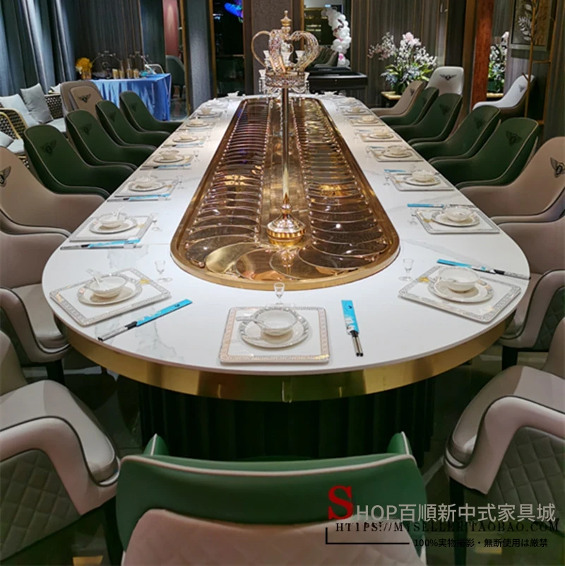 新中式デザインのエレガントな楕円形電動レストランテーブル - 20人用回転式長方形個室、餃子専門店やホテル、クラブに最適!快適な食事体験を提供します!