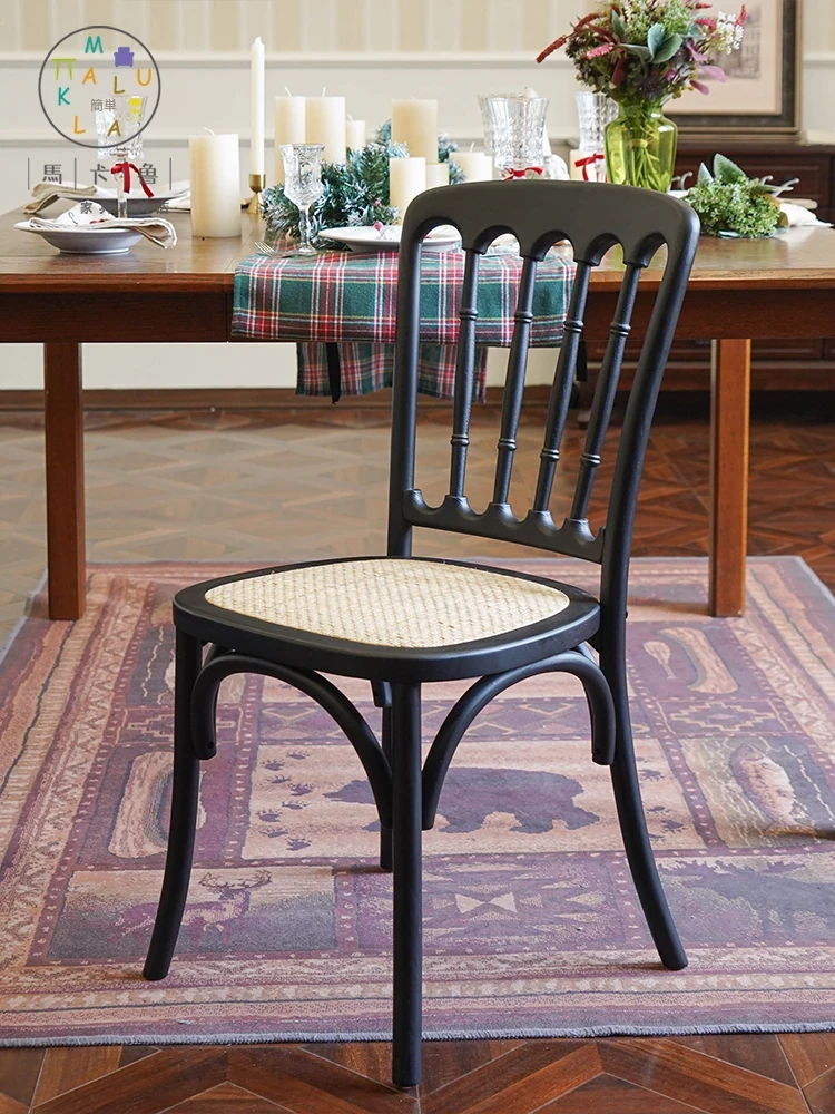 マカロウ無垢材ヴィンテージラタン編みダイニングチェア フランス風 背もたれ付き シンプルでおしゃれな家庭用 民宿や軽やかなレストラン、カフェにぴったりな椅子