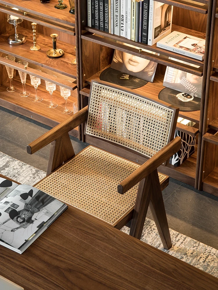 チャンディガールチェア ブラックウォールナット無垢材 ダイニングチェア レトロなラタン編み 肘掛け付き 中古家具 書斎用椅子 - 上質なインテリアで、心地よいひとときを演出します!