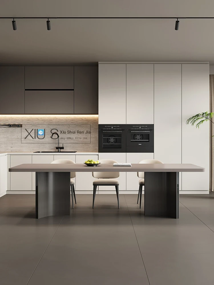 In-Stock Modern Minimalist Thickened Italian-Style Solid Color Dining Table and Chair Set with Electric Induction Cooktop - Rectangular Island Table for Contemporary Dining and Tea Experience