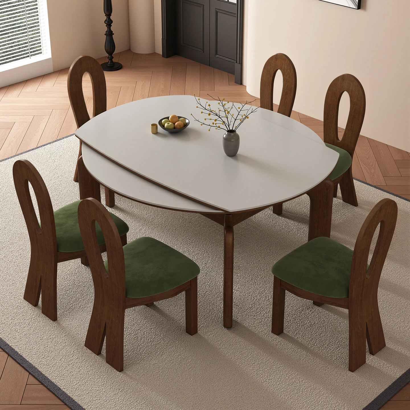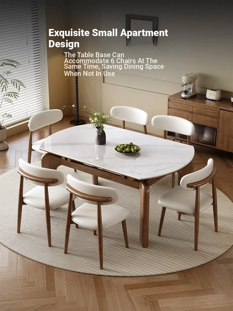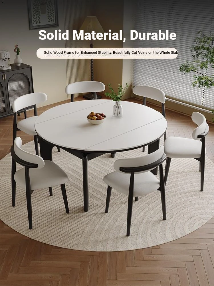 2025 New French Style Solid Wood Folding Dining Table and Chairs Set - Space-Saving Round Table for Small Apartments, Adjustable and Extendable with Durable Rock Slab Top for Dining Room