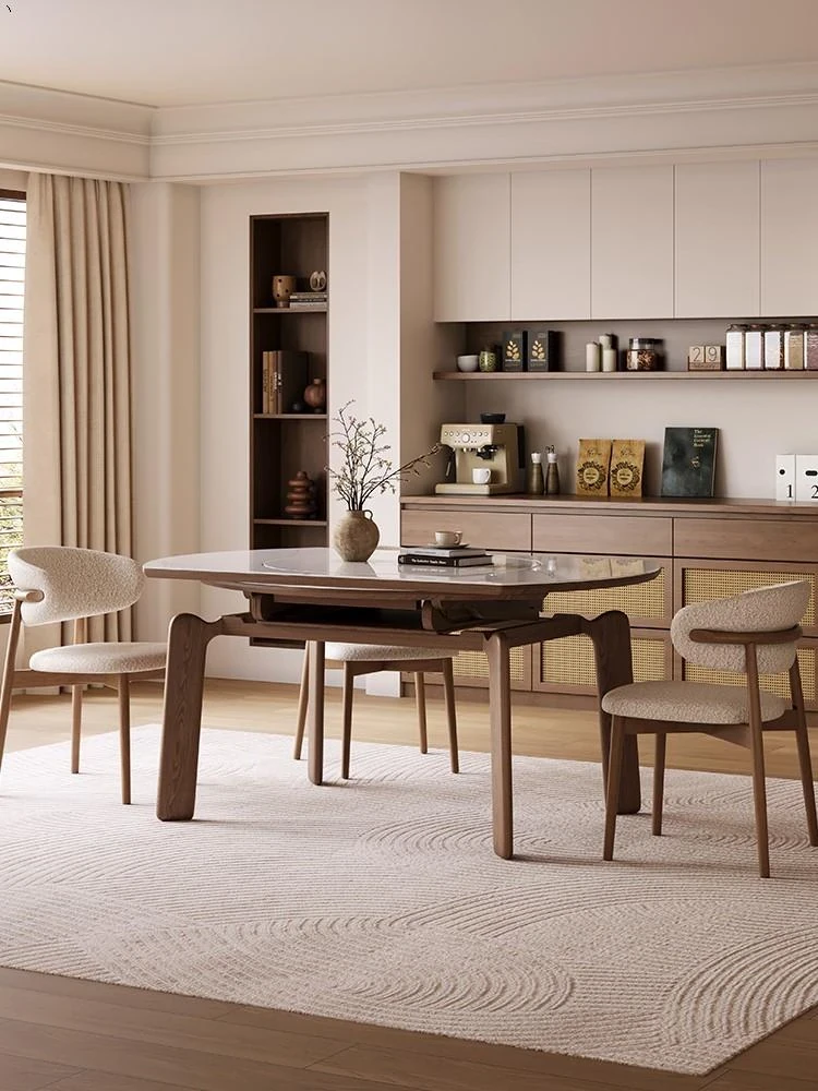 Modern Minimalist Rock Plate Dining Table for Small Spaces - Built-in Induction Cooktop with Warm Food Rotating Tray and Expandable Solid Wood Design
