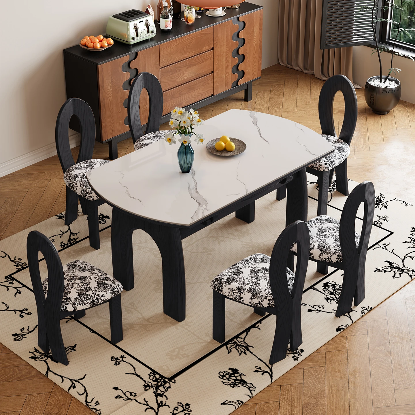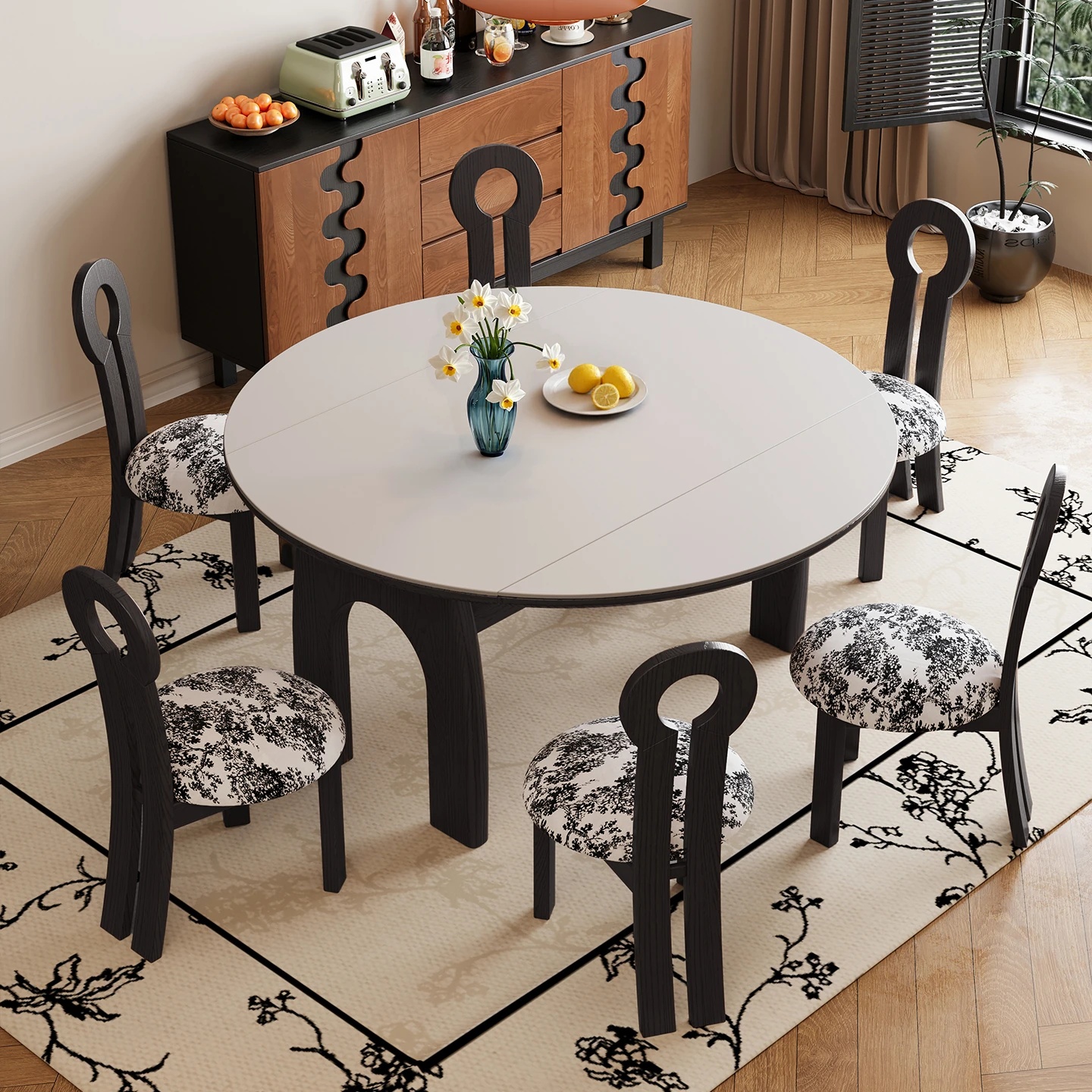 Retro Expandable Rock Board Dining Table Set - Versatile Round/Square Design for Small Spaces, Made of Black and White Ash Wood, Perfect for Dining and Entertaining.