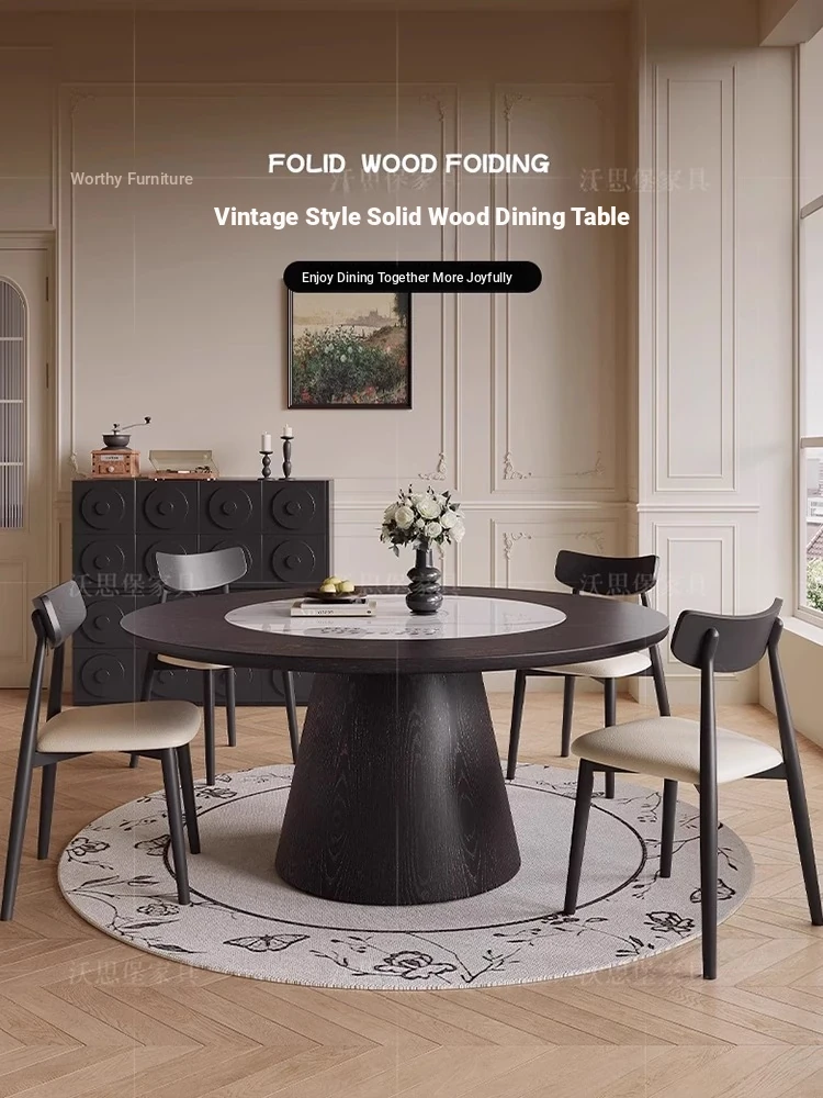French Vintage Style Expandable Folding Rock Plate Dining Table and Chair Set - Perfect for Small Spaces, Versatile Round Design, Solid Wood Home Dining Table