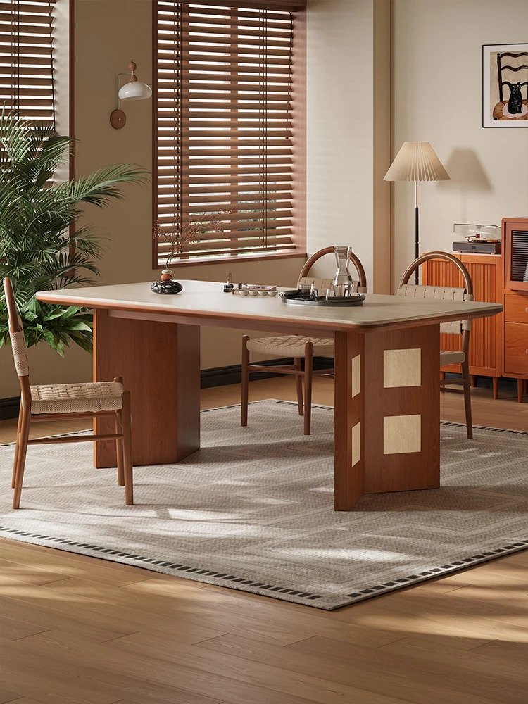 Walnut Dining Table Set - 2025 New Vintage Style Rectangular Table with Rock Slab Surface and Solid Wood Chairs for Home Dining Room