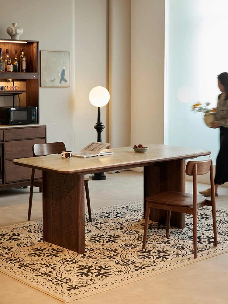 Modern Minimalist Wabi-Sabi Retro Walnut Dining Table and Chair Set - Thickened Rectangular Design with Natural Wood Grain Finish