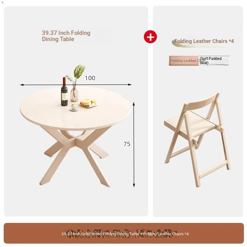 [All Solid Wood] 39.37 in Round Table + Foldable Leather Chair * 4 (White)