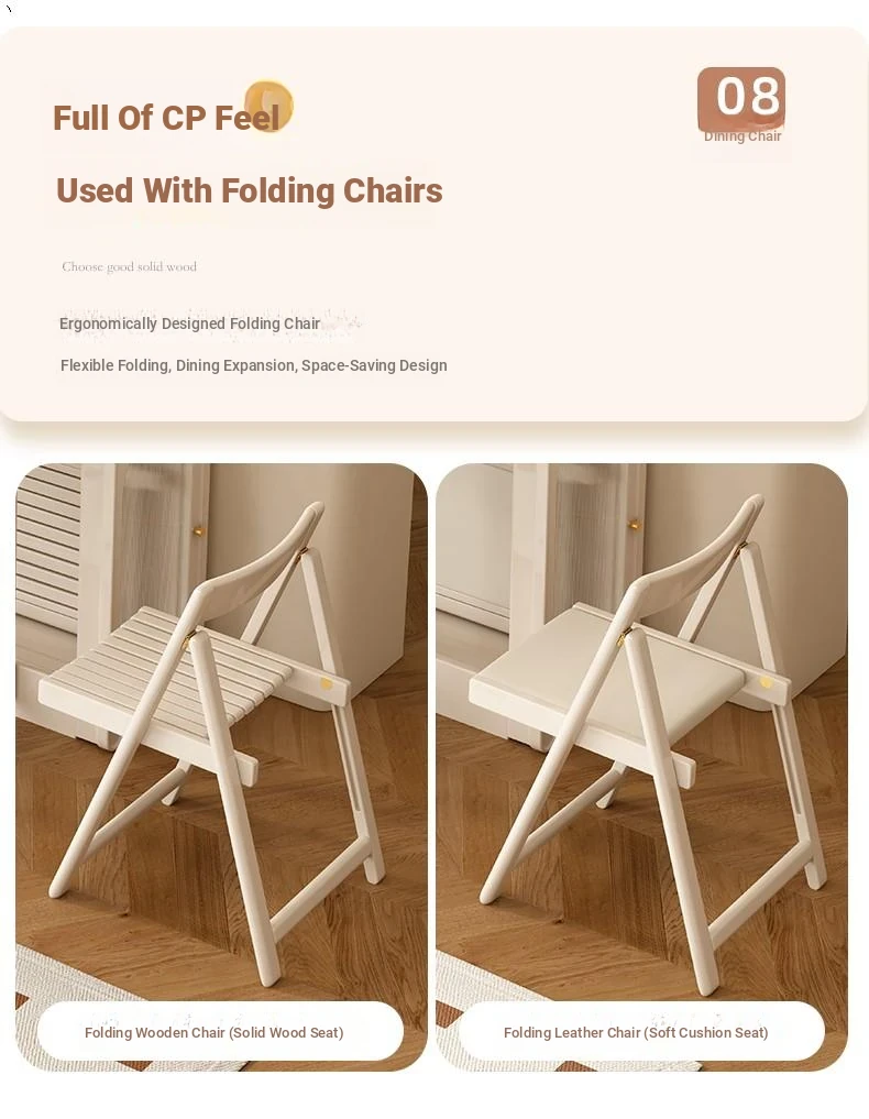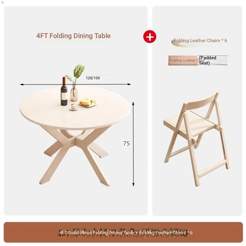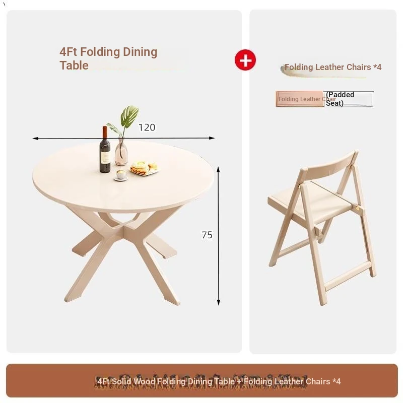 [All Solid Wood] 47.24 in Round Table + Foldable Leather Chair * 4 (White)