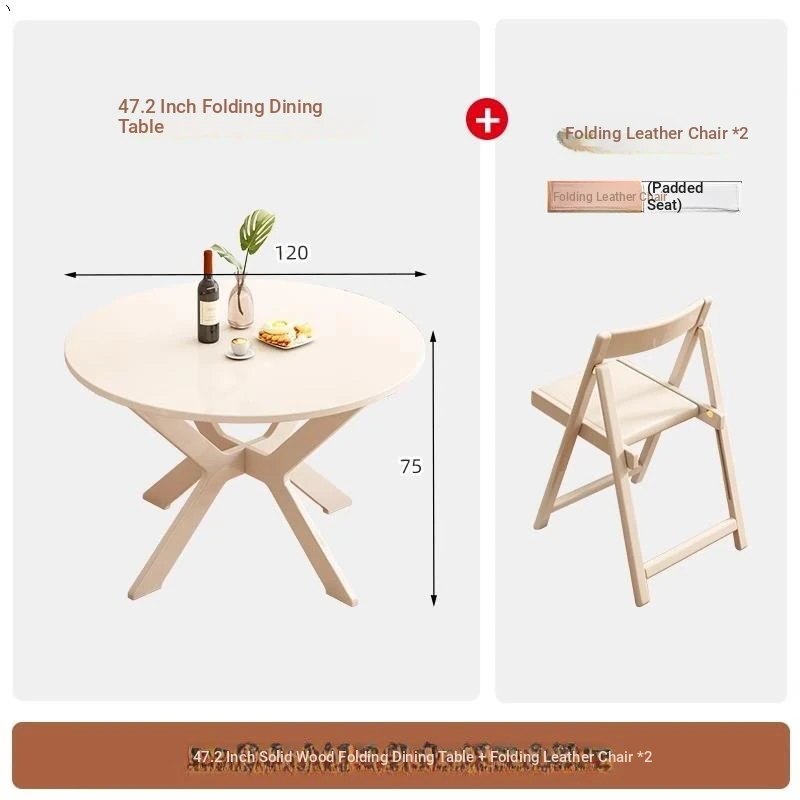 [All Solid Wood] 47.24 in Round Table + Foldable Leather Chair * 2 (White)