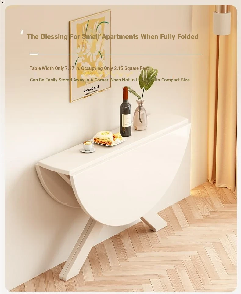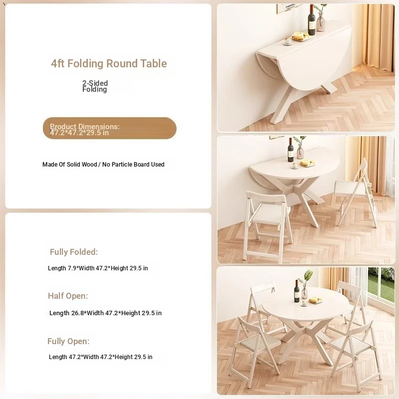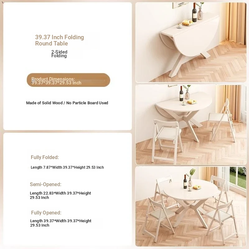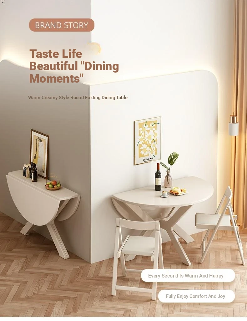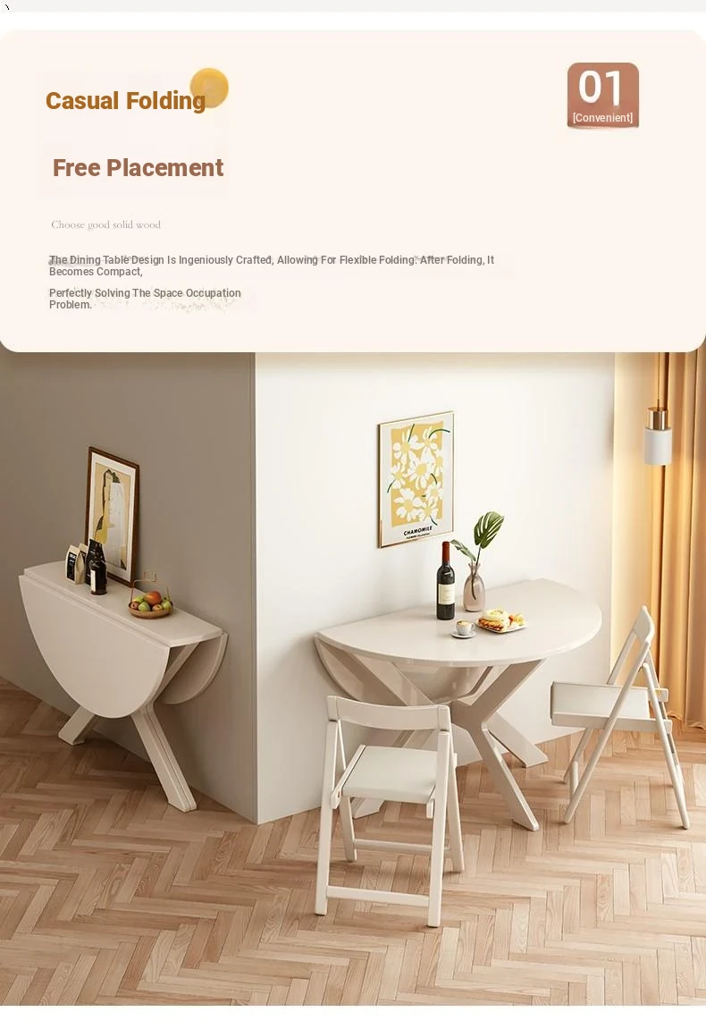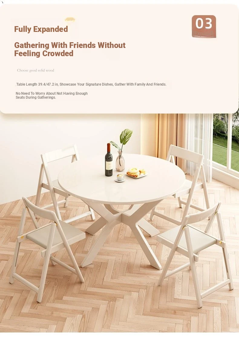 Creamy Expandable Round Dining Table for Home - Space-Saving 1 Meter Solid Wood Table for 4 People, Perfect for Small Apartments, Multi-Functional with Narrow Edge Folding Design.