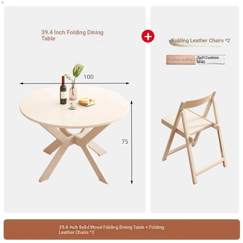 [All Solid Wood] 39.37 in Round Table + Foldable Leather Chair * 2 (White)