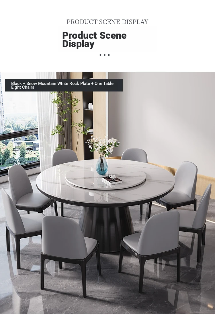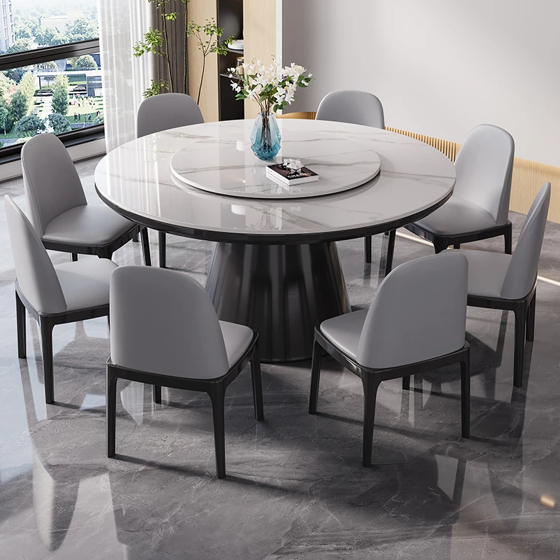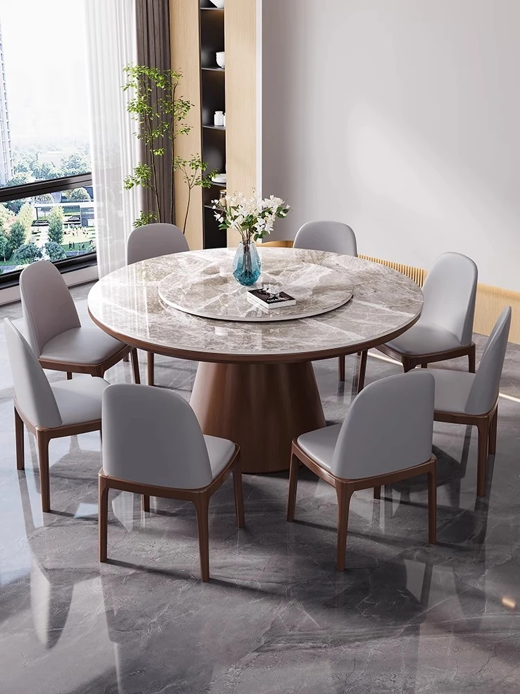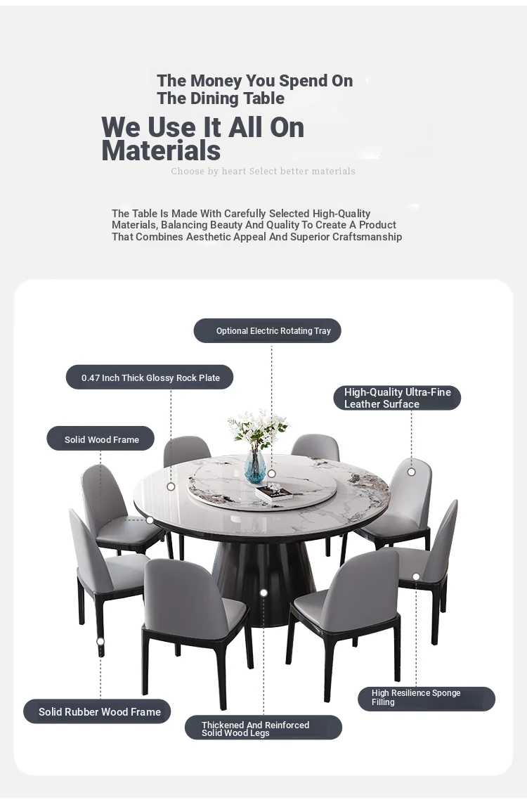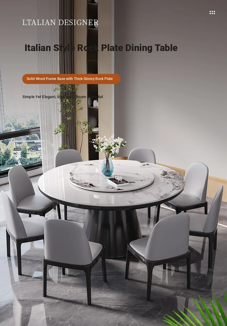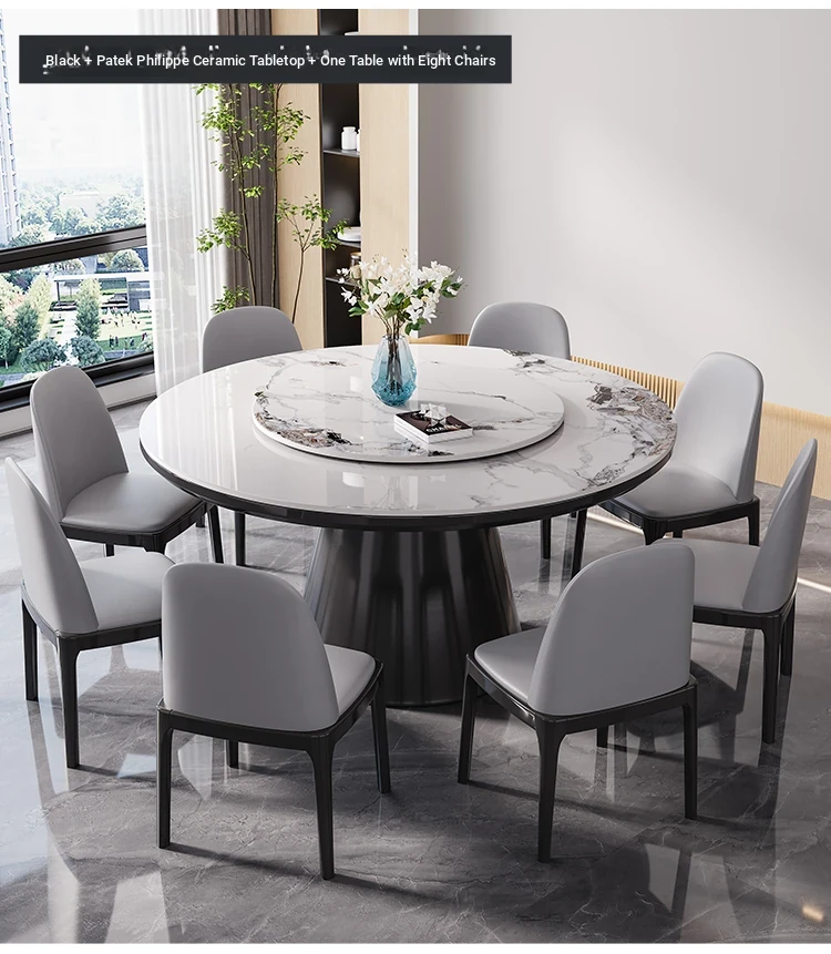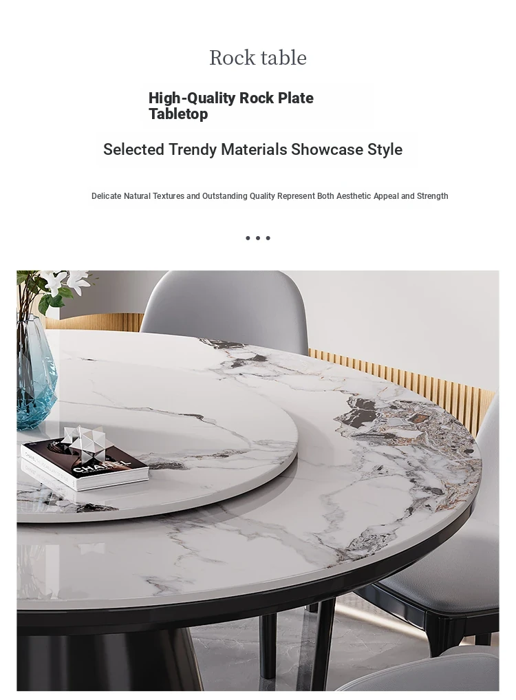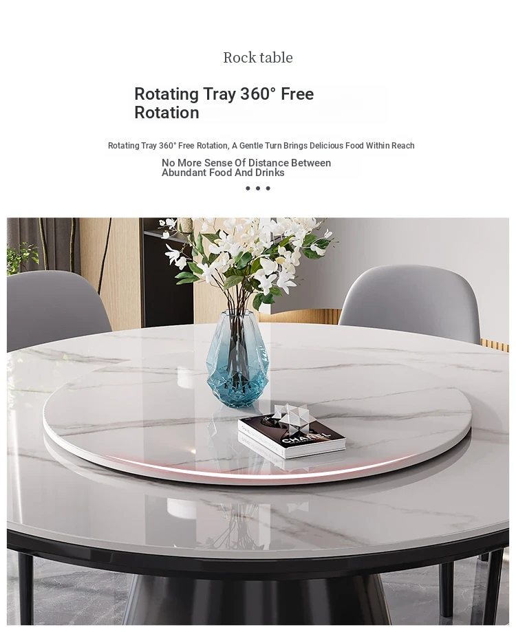 Elegant Glossy Rock Board Dining Table and Chair Set - Solid Wood Round Table with Rotating Tray for Home and Restaurant - Minimalist Design for Effortless Dining Experience