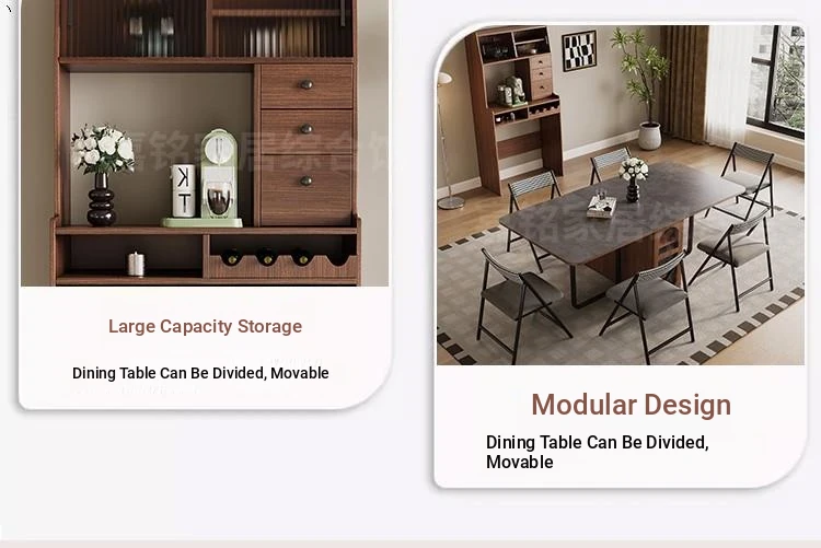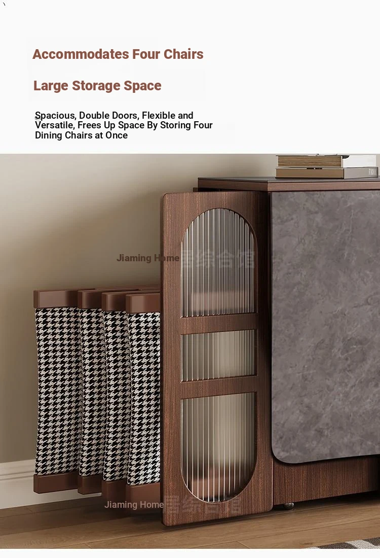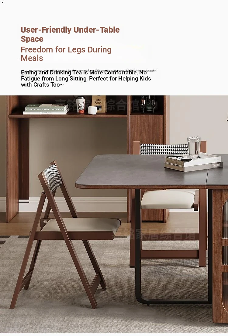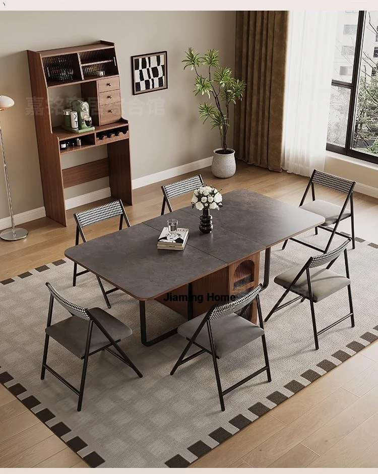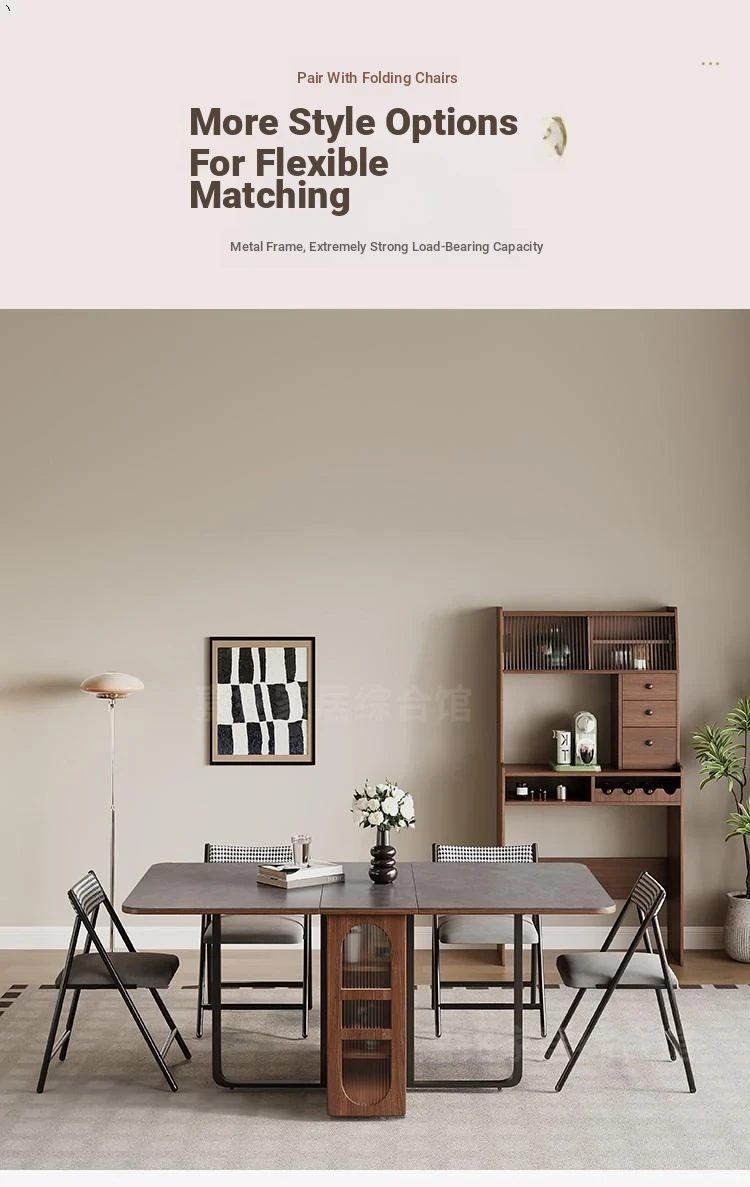 Rock plate Foldable table + high sideboard cabinet (solid wood) +6 walnut color metal chair square table top