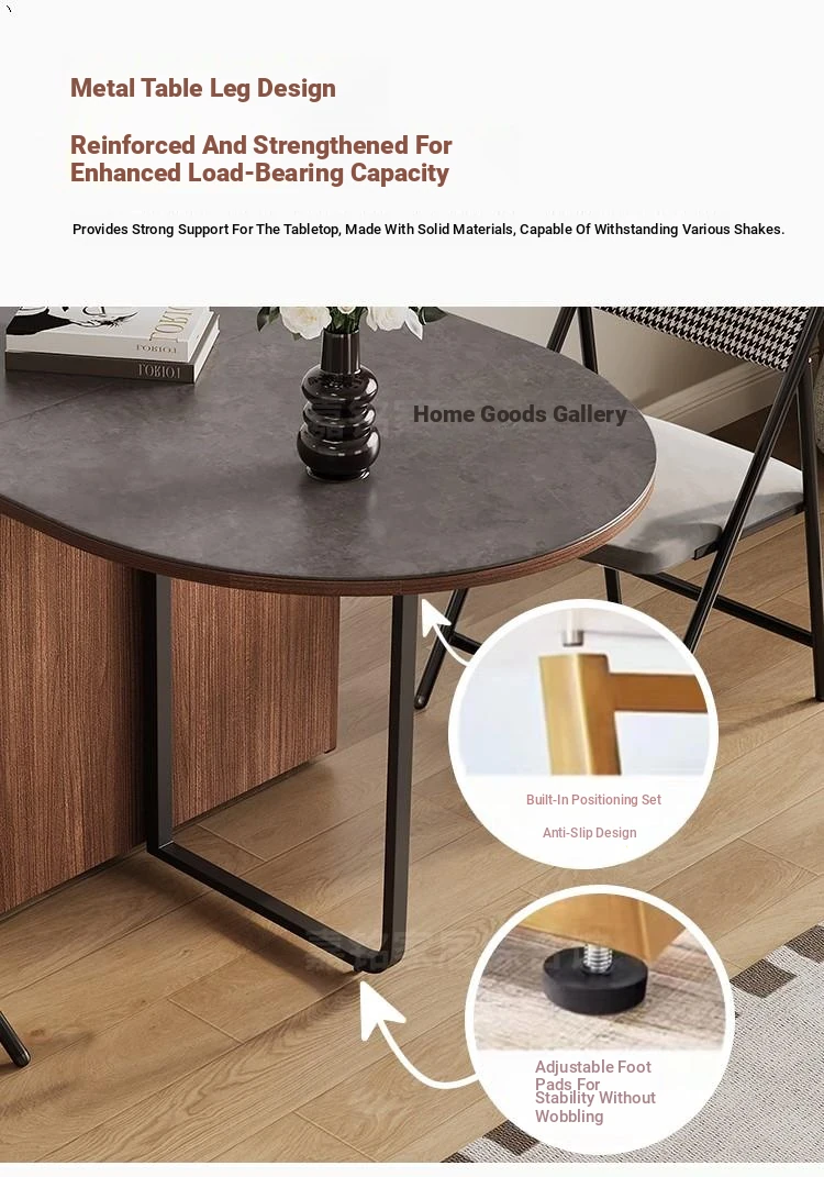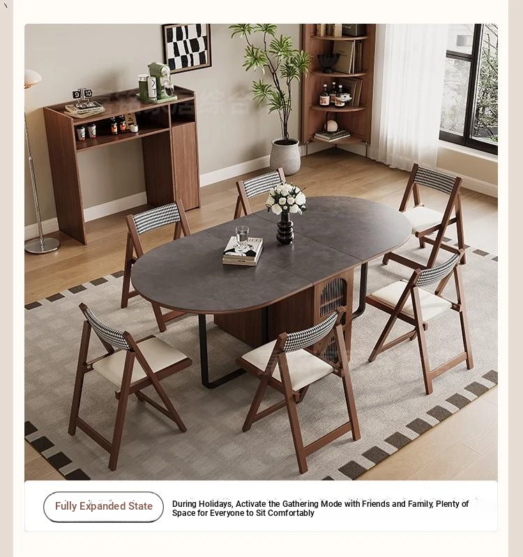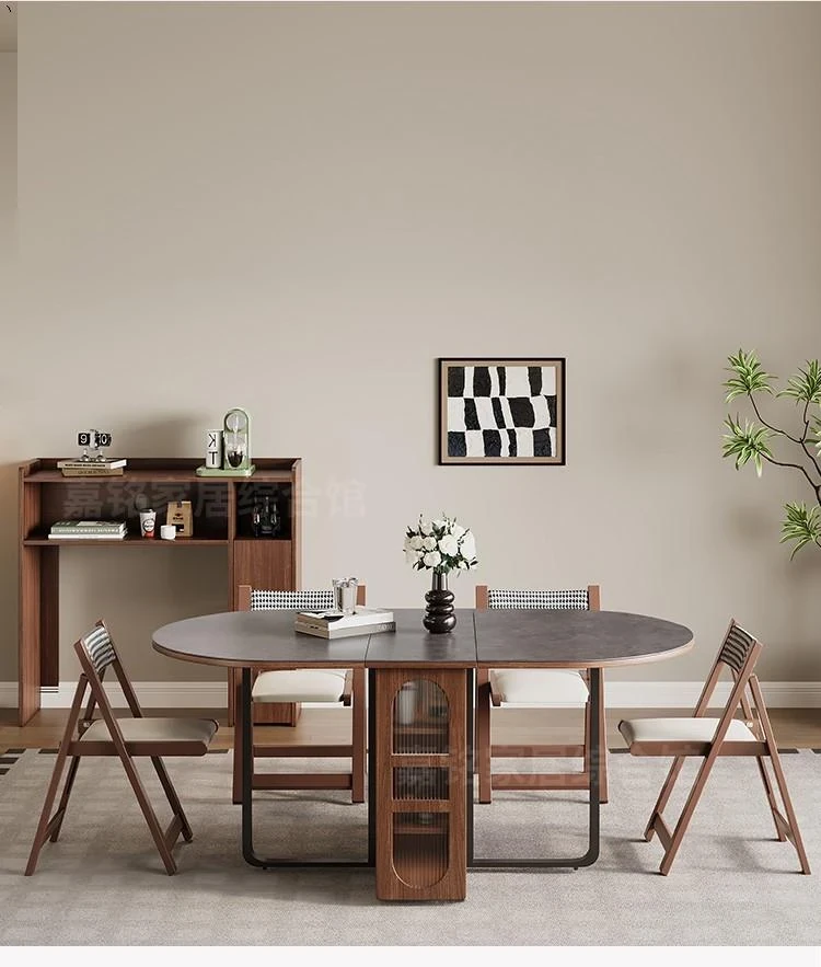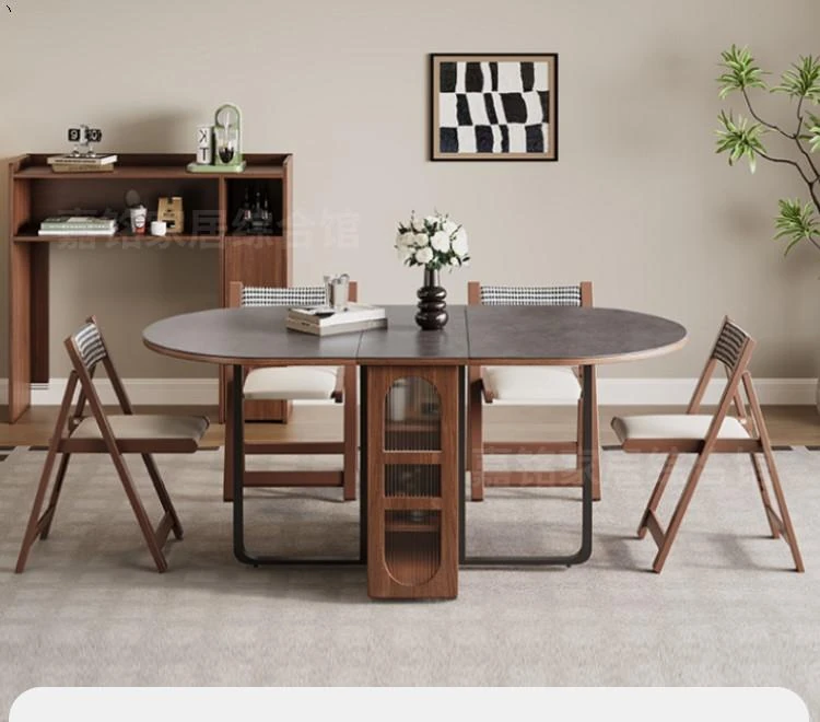 Rock plate Foldable table + sideboard (solid wood) +6 walnut color metal chair oval table top