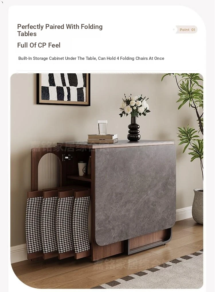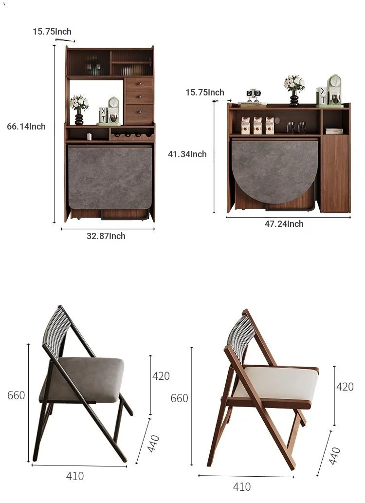 Rock plate Foldable table + high sideboard cabinet (solid wood) +4 walnut color metal chair square table top
