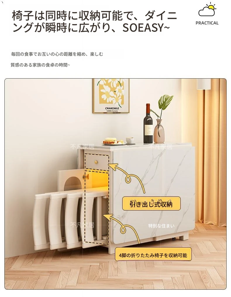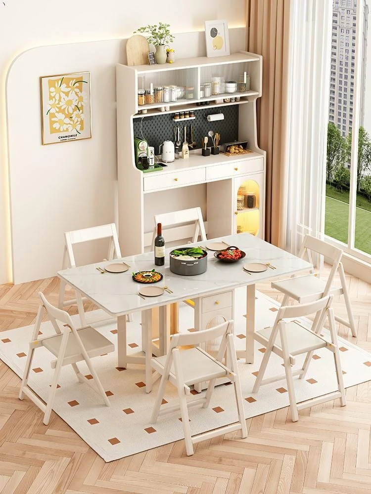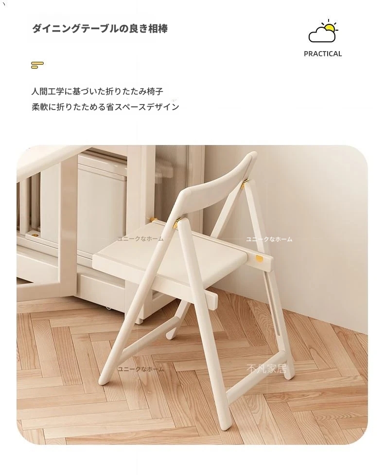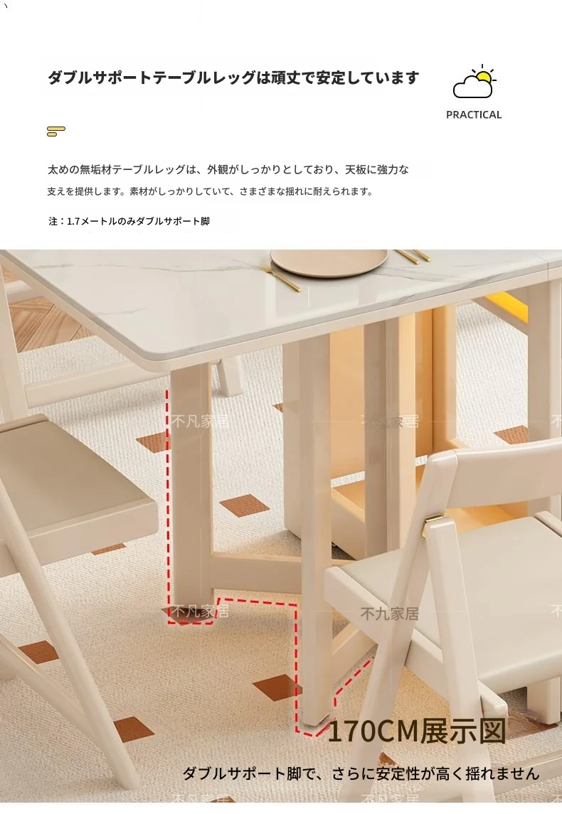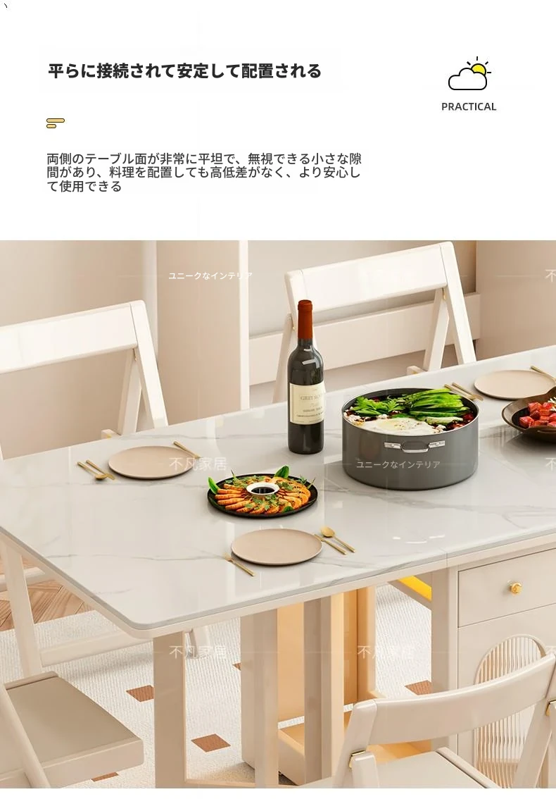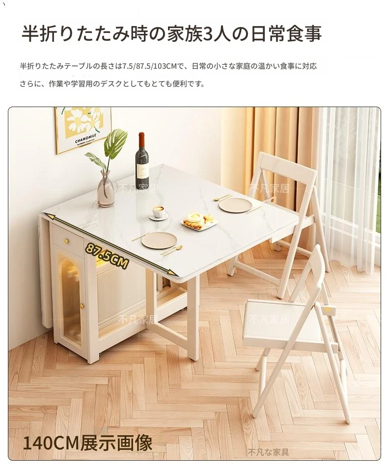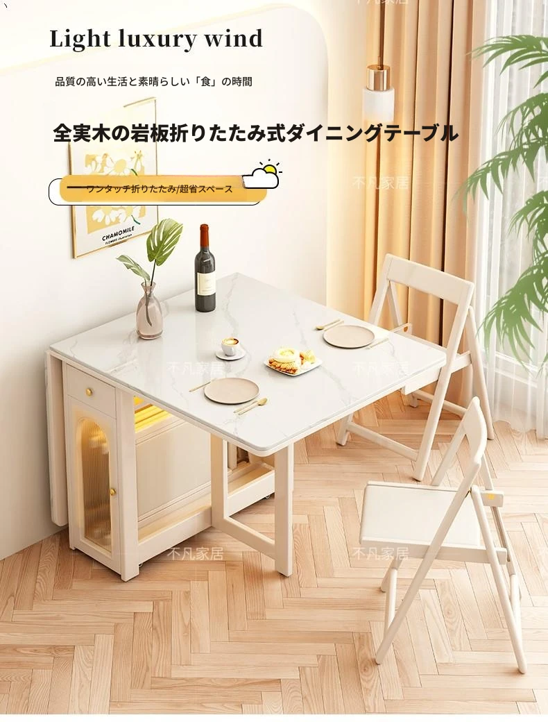 クリーム風折りたたみ岩板ダイニングテーブル&チェアセット - シンプルでスタイリッシュな白色、家庭に最適!多機能で移動可能な無垢材製の食卓で、毎日の食事を特別な時間に演出します。
