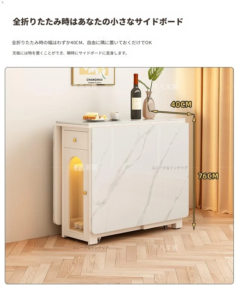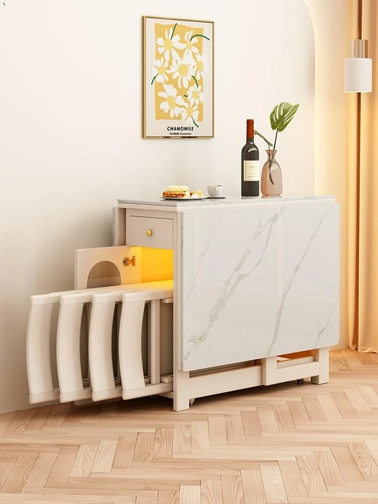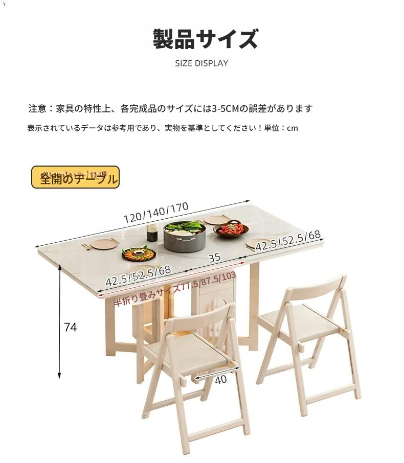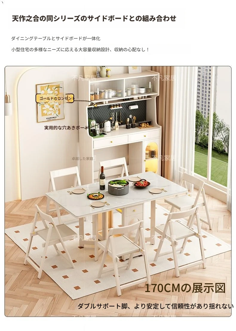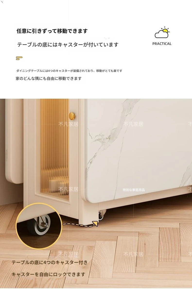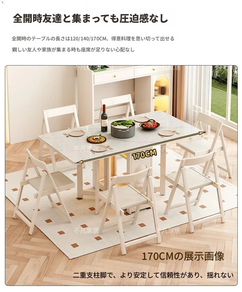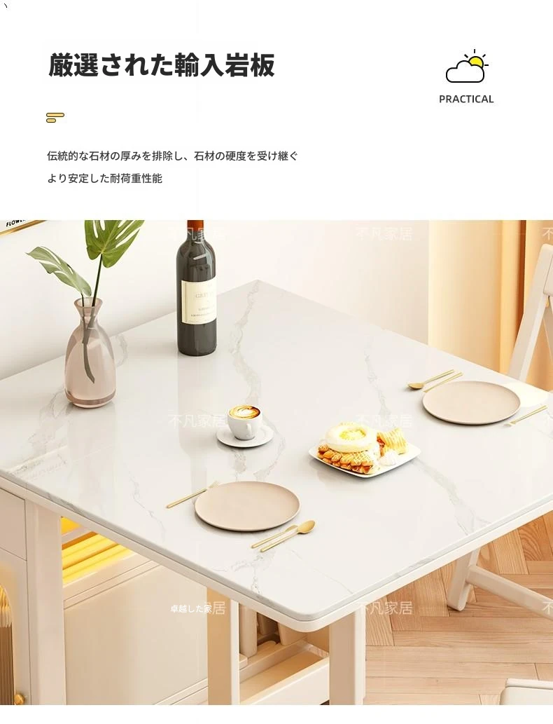 クリーム風折りたたみ岩板ダイニングテーブル&チェアセット - シンプルでスタイリッシュな白色、家庭に最適!多機能で移動可能な無垢材製の食卓で、毎日の食事を特別な時間に演出します。