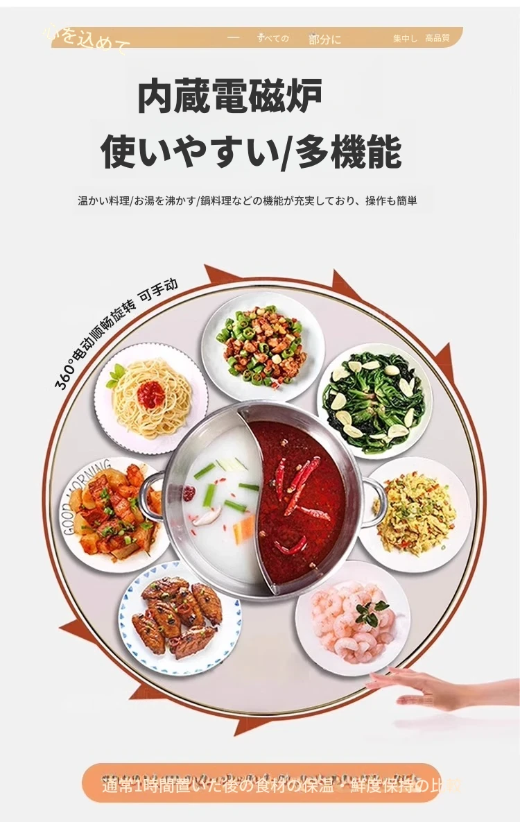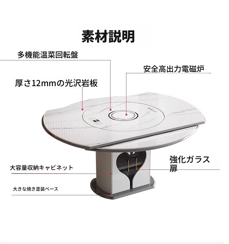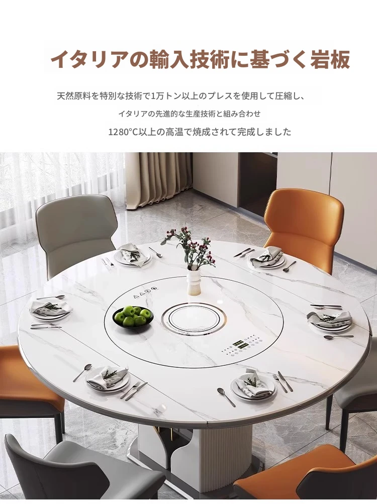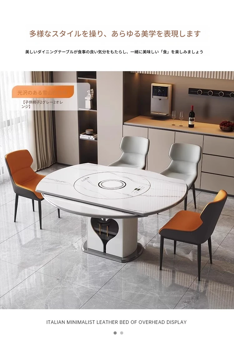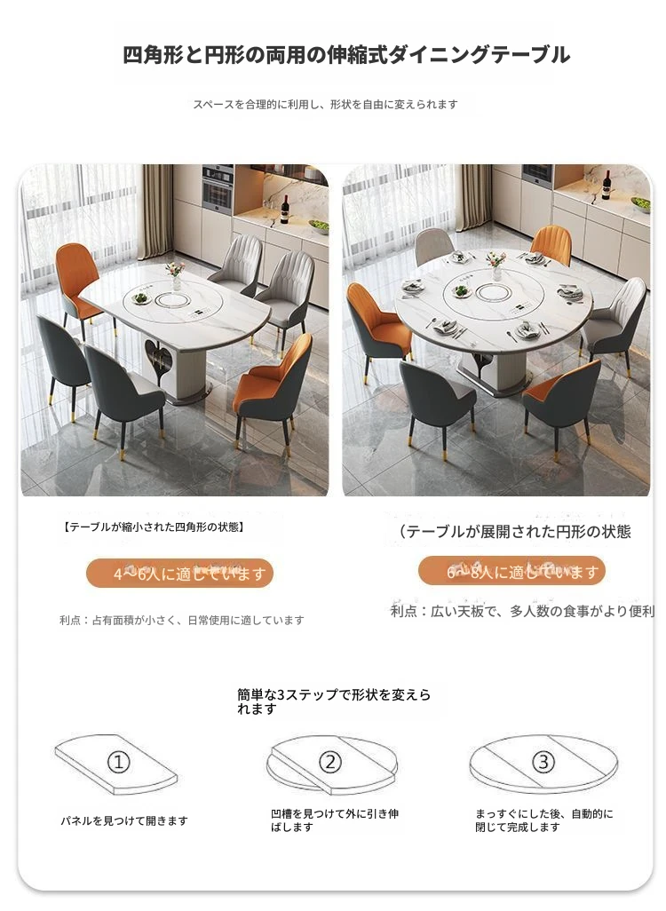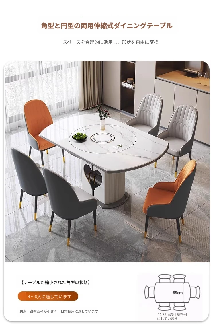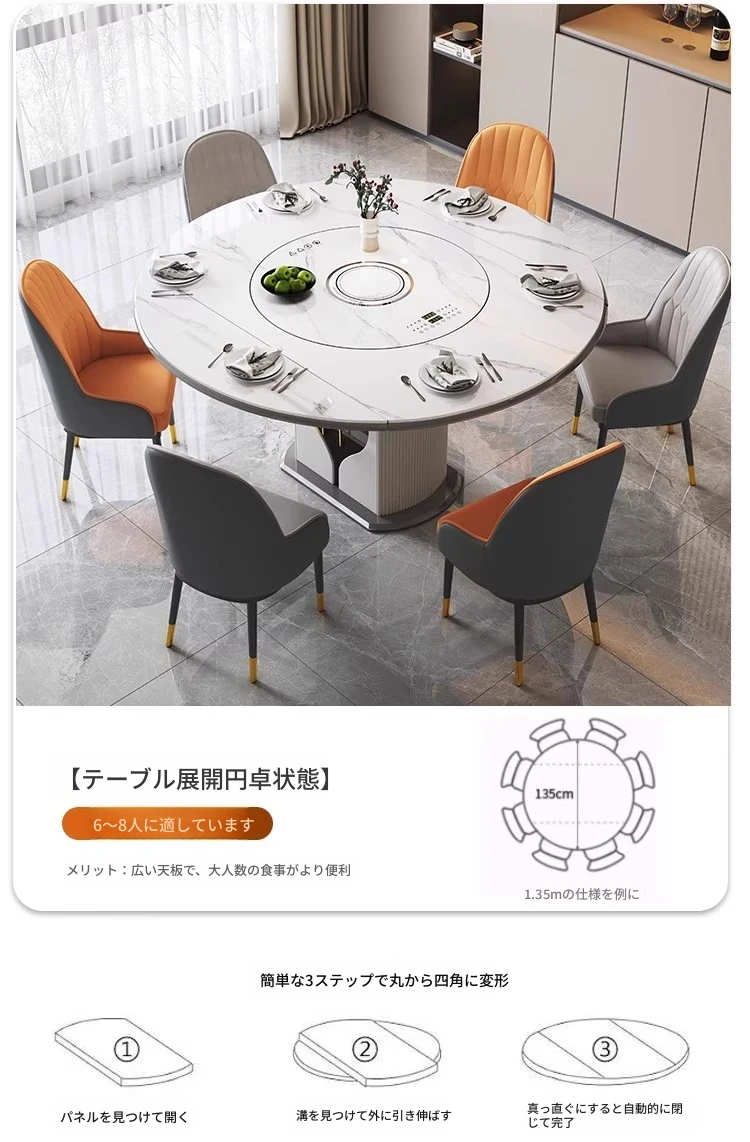 軽やかな高級感のある光沢仕上げ、伸縮可能な方形・円形両用デザイン!電磁調理器対応の温菜回転トレイ付き、モダンシンプルな家庭用ラウンドダイニングテーブル。あなたの食卓を華やかに演出します!