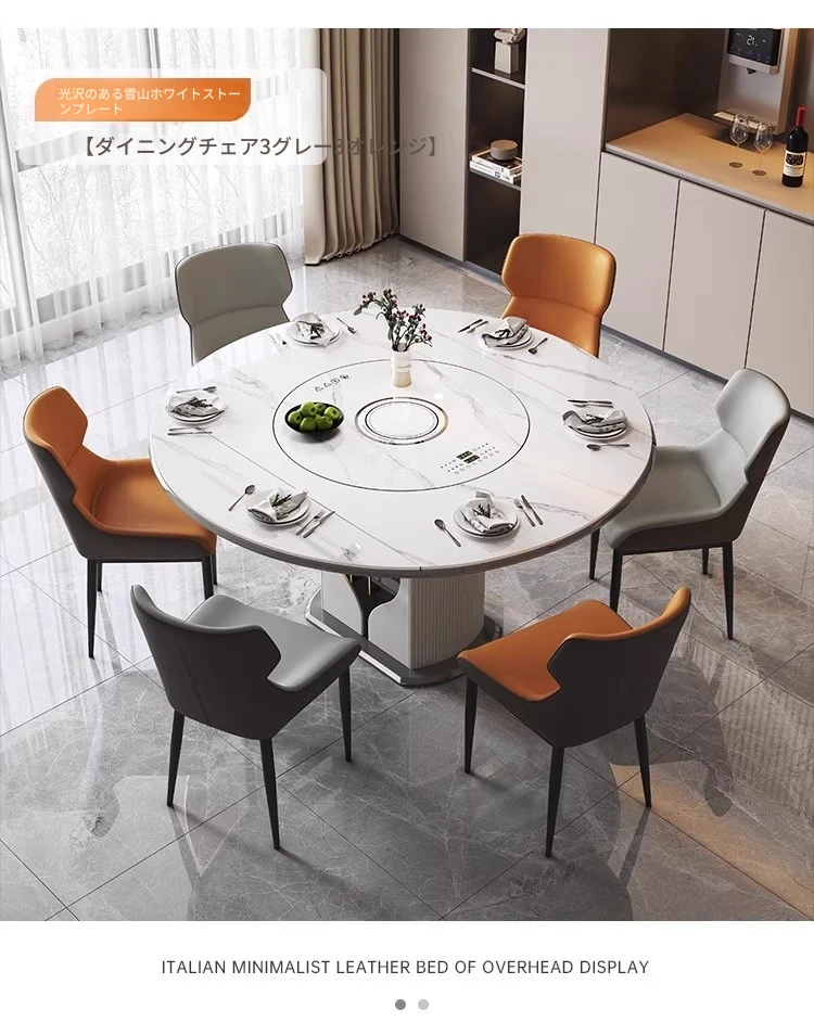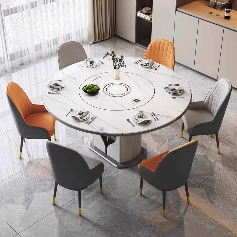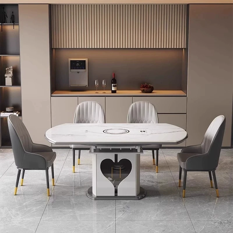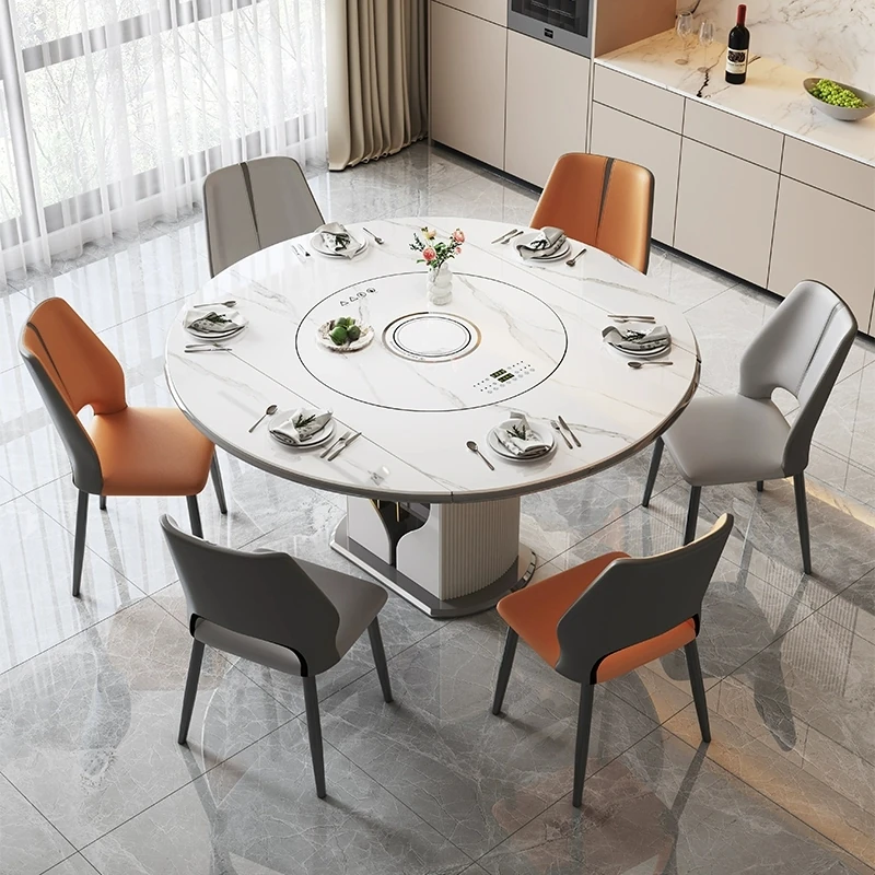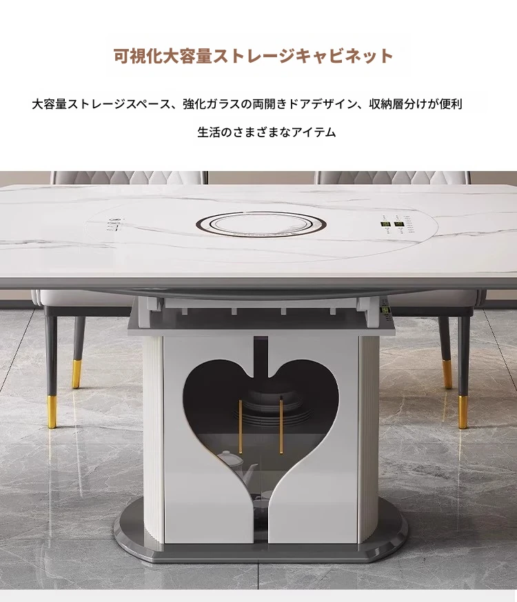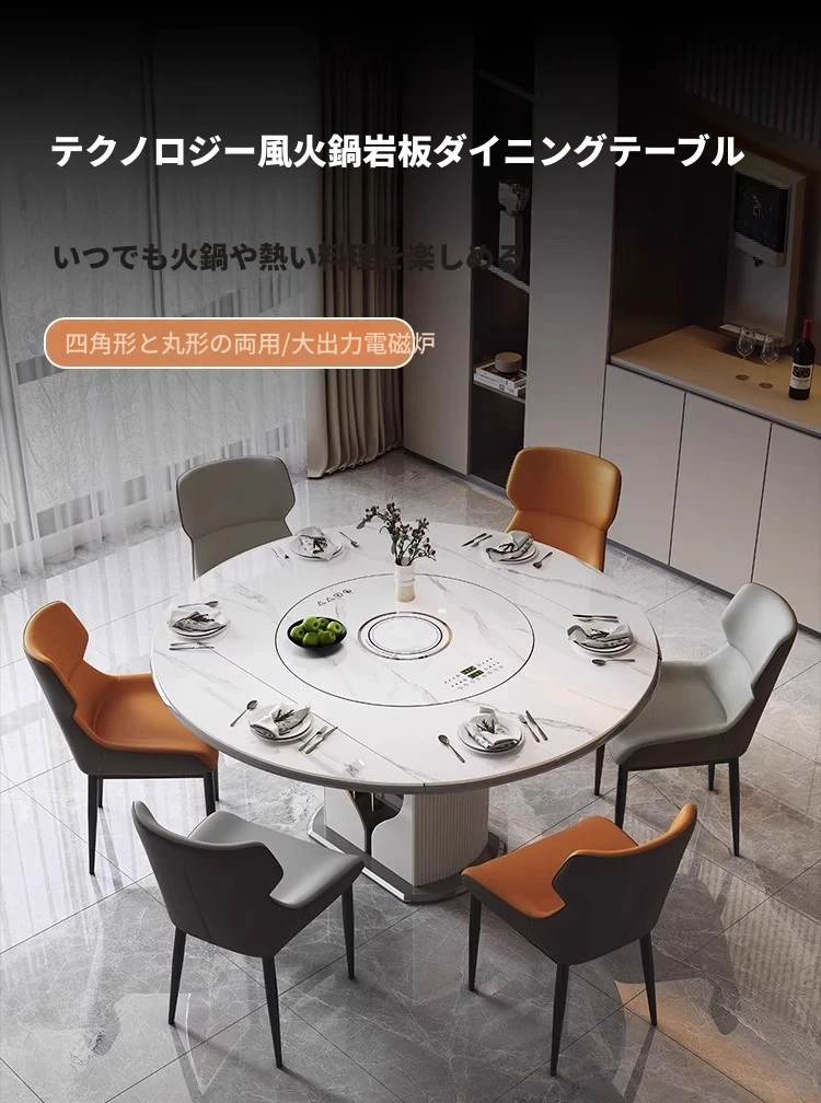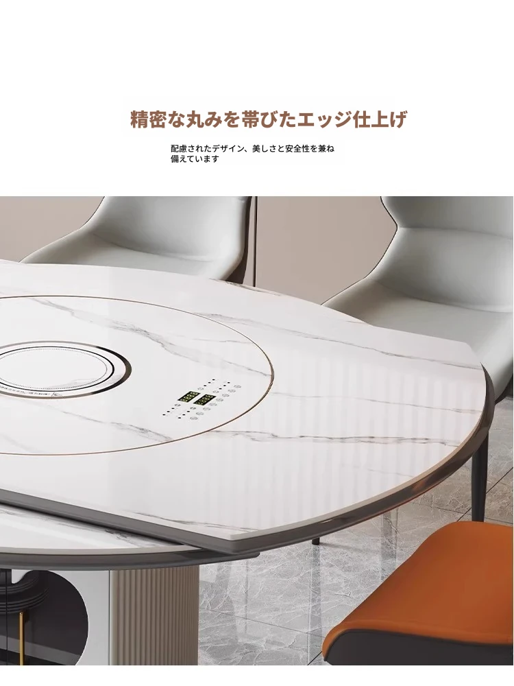 軽やかな高級感のある光沢仕上げ、伸縮可能な方形・円形両用デザイン!電磁調理器対応の温菜回転トレイ付き、モダンシンプルな家庭用ラウンドダイニングテーブル。あなたの食卓を華やかに演出します!