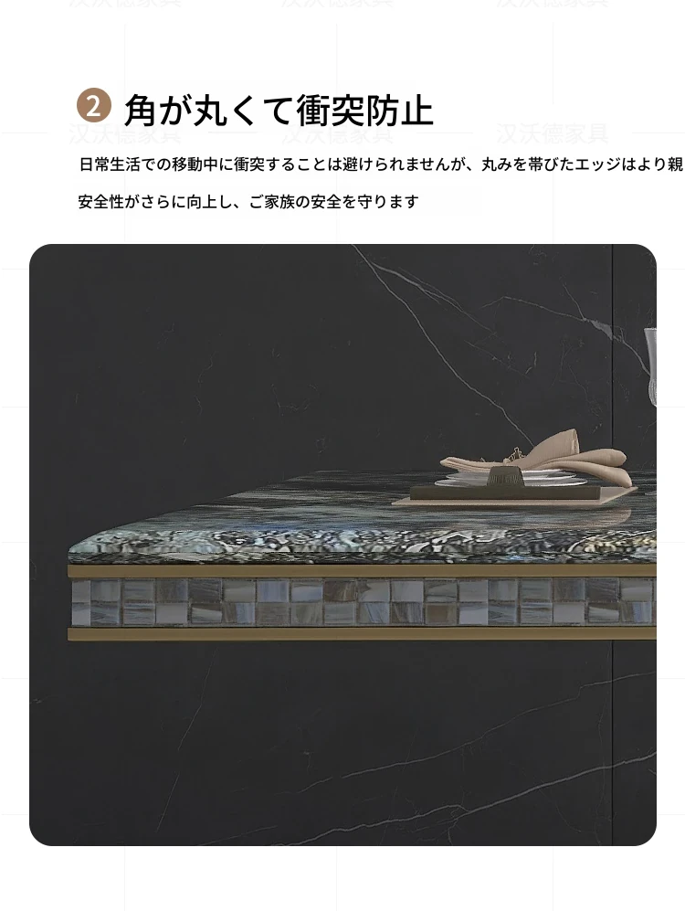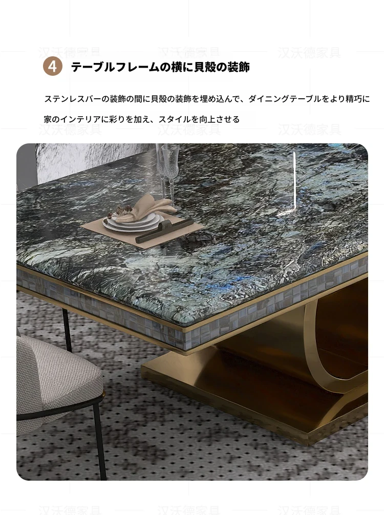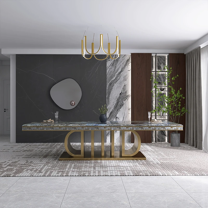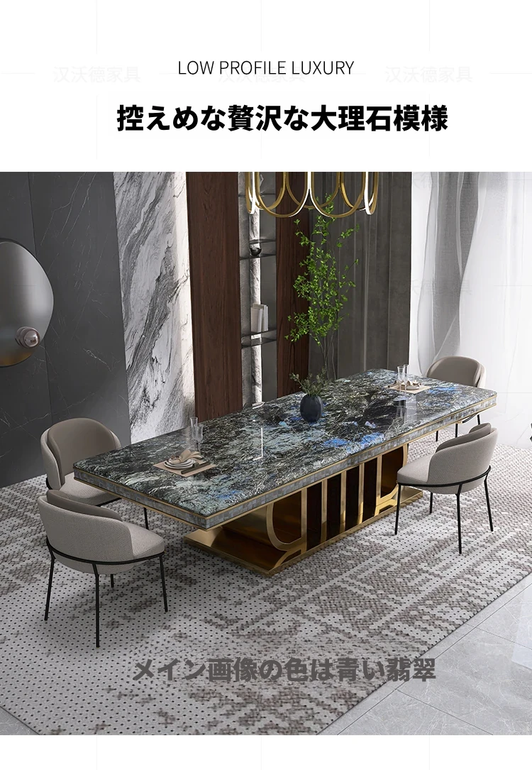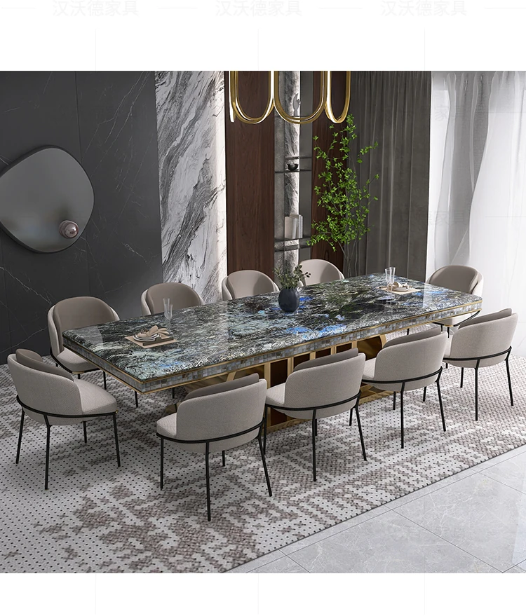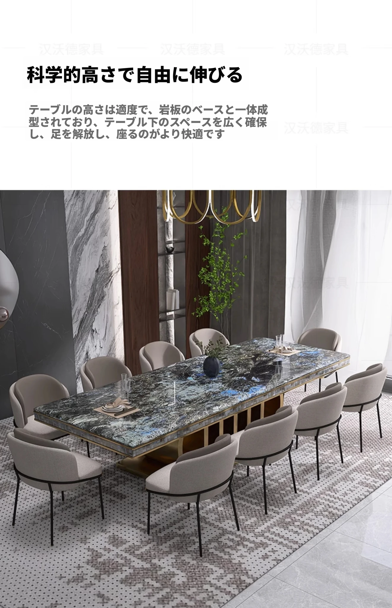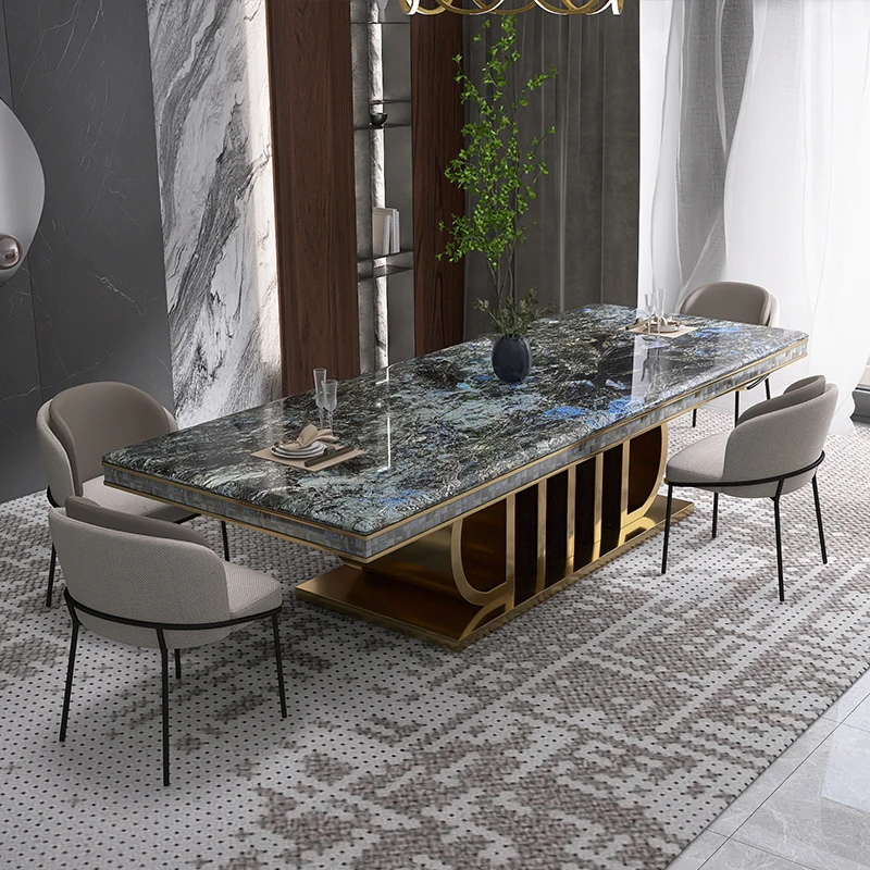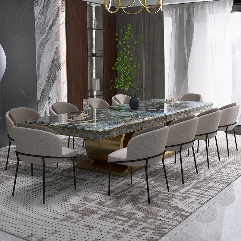 高級感溢れる大理石の長方形ダイニングテーブル - 10人用、ブルージェイドデザインの贅沢な別荘スタイル食卓。家族や友人との特別なひとときを演出します。