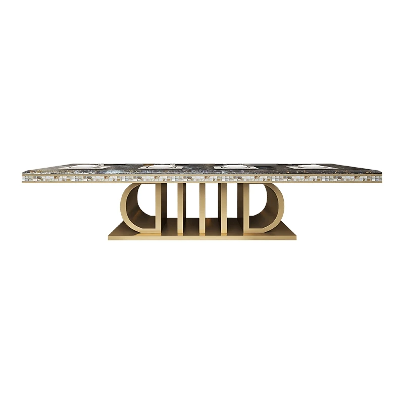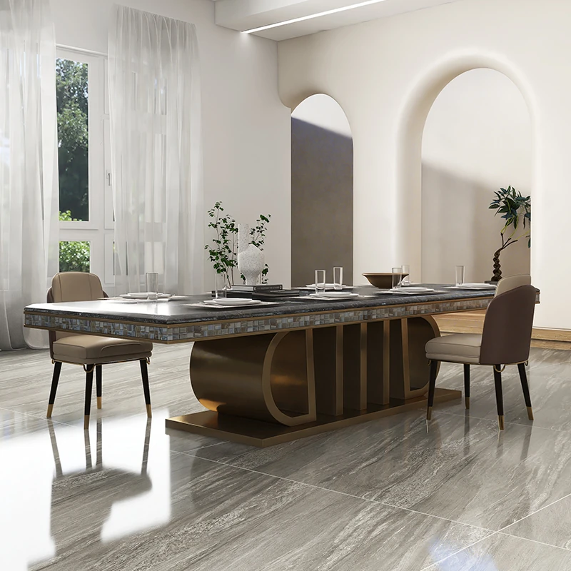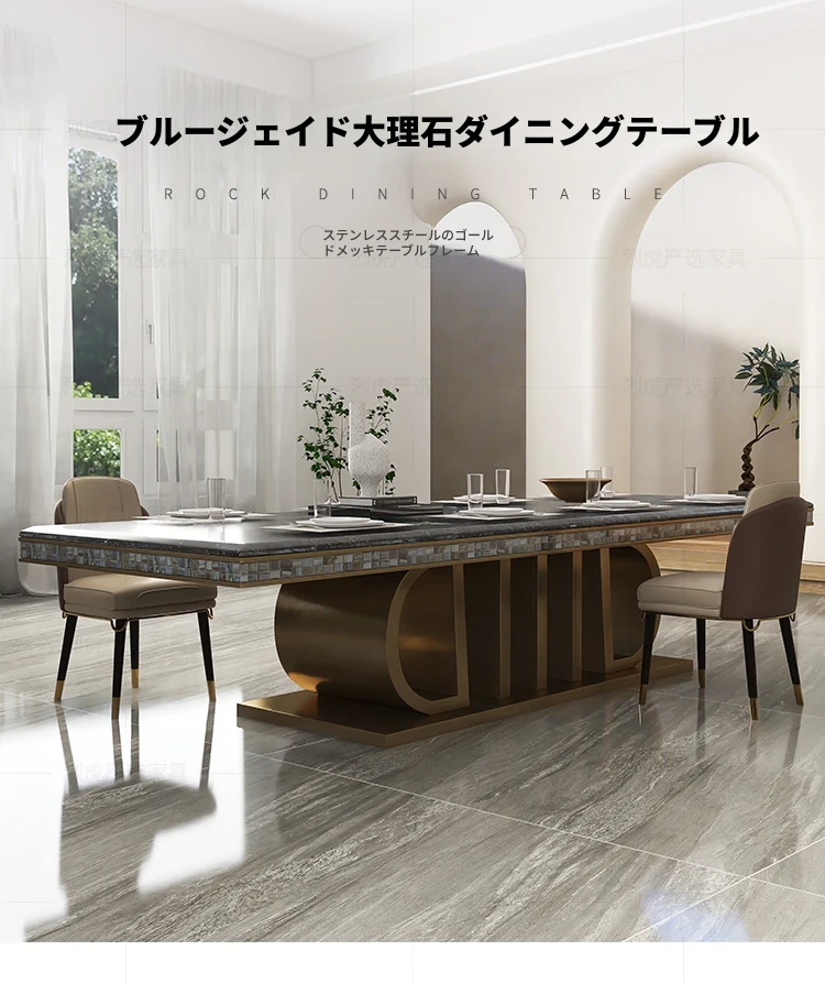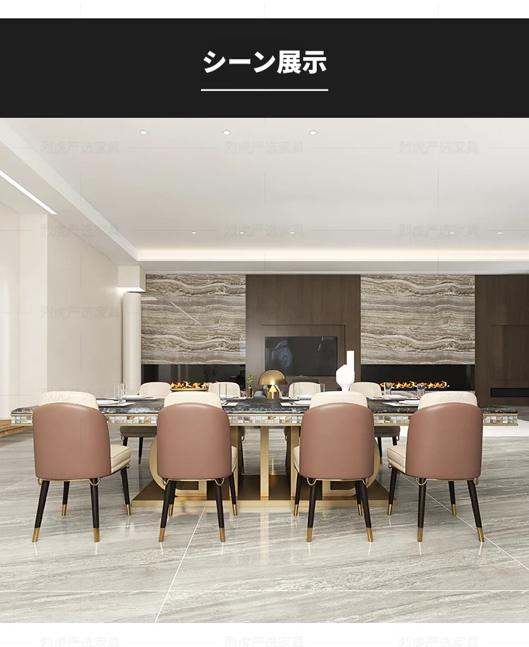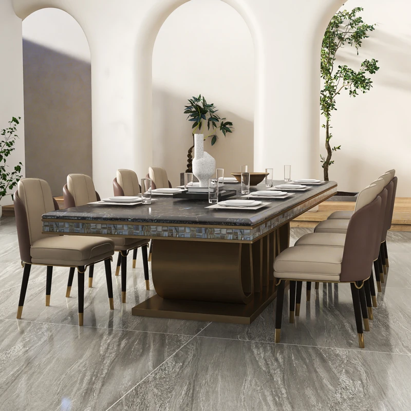 高級感あふれる大理石長方形ダイニングテーブルセット - ヴィラ向け、10人用シェルデザインの高級石製テーブル&チェアコンビネーション!特別なひとときを演出する、洗練されたインテリアにぴったり!