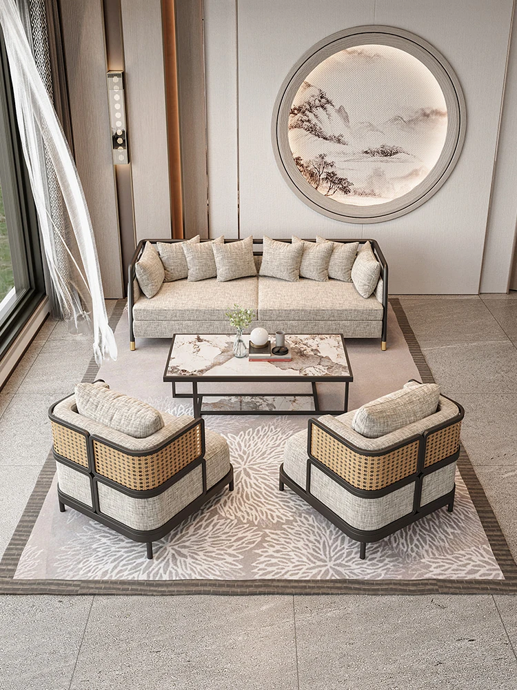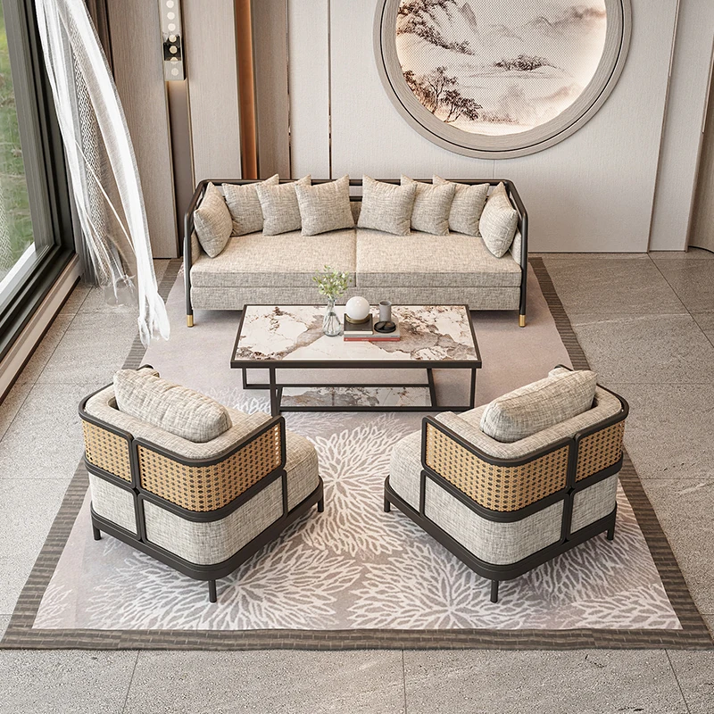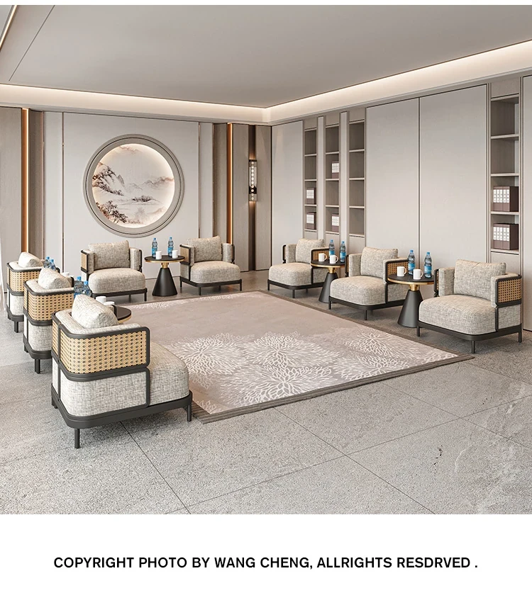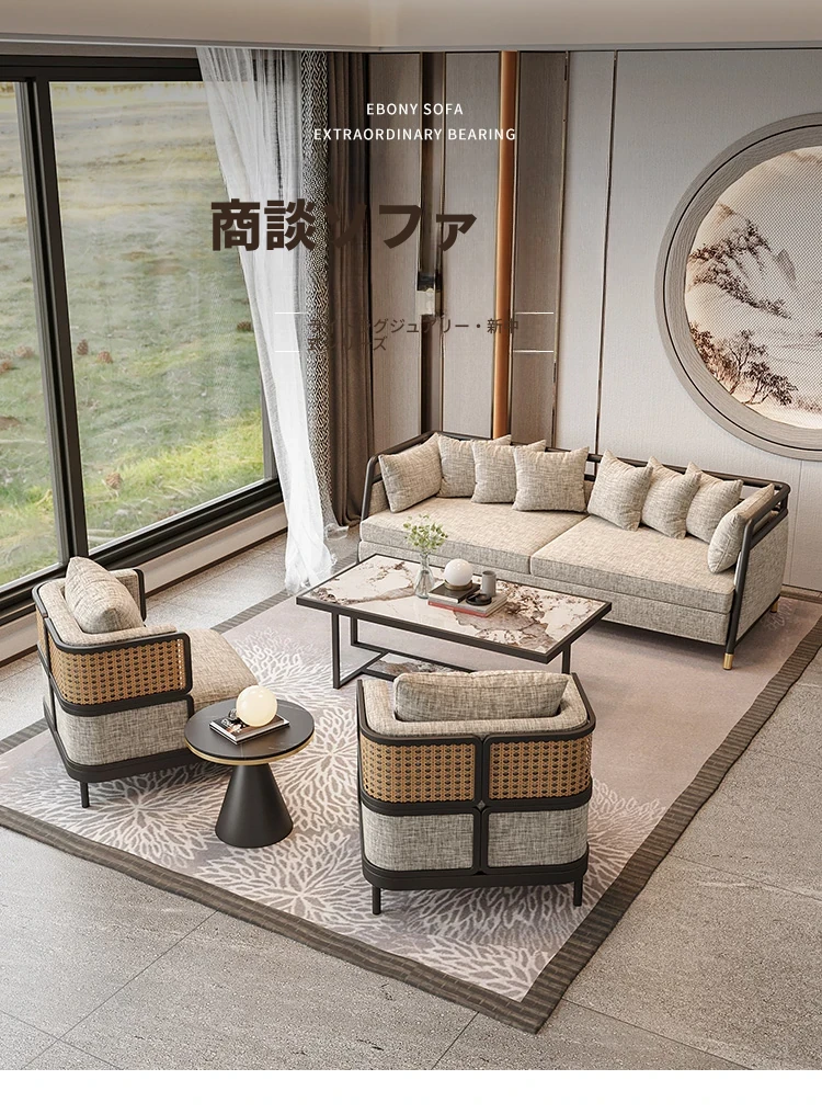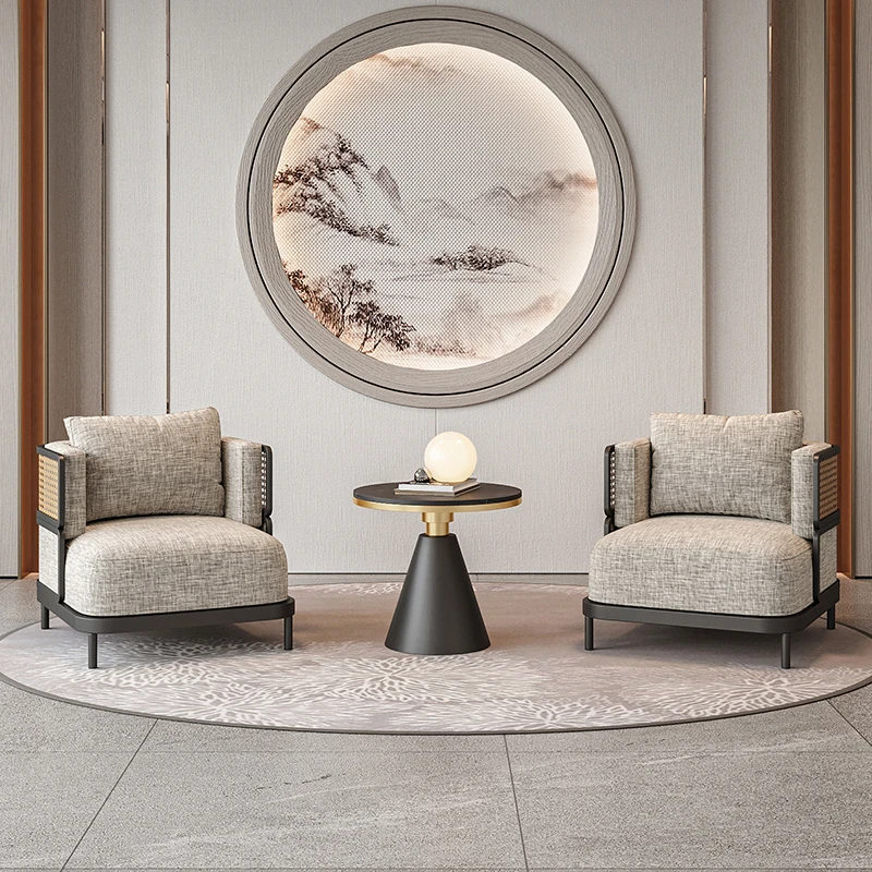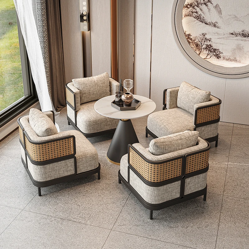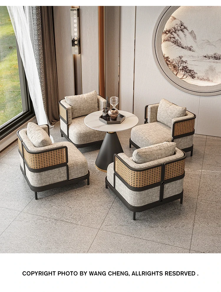 新中式デザインの接待テーブル&チェアセット|販売センター、ホテル、茶室、クラブに最適|洽談用ソファとアームチェア|一卓四脚のリラックス空間を演出!