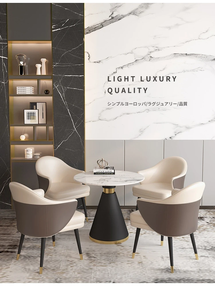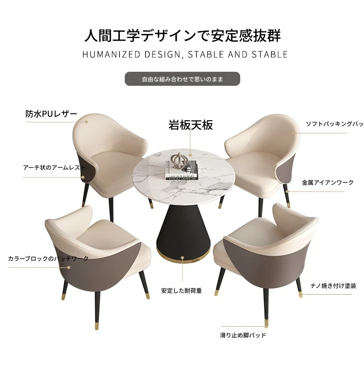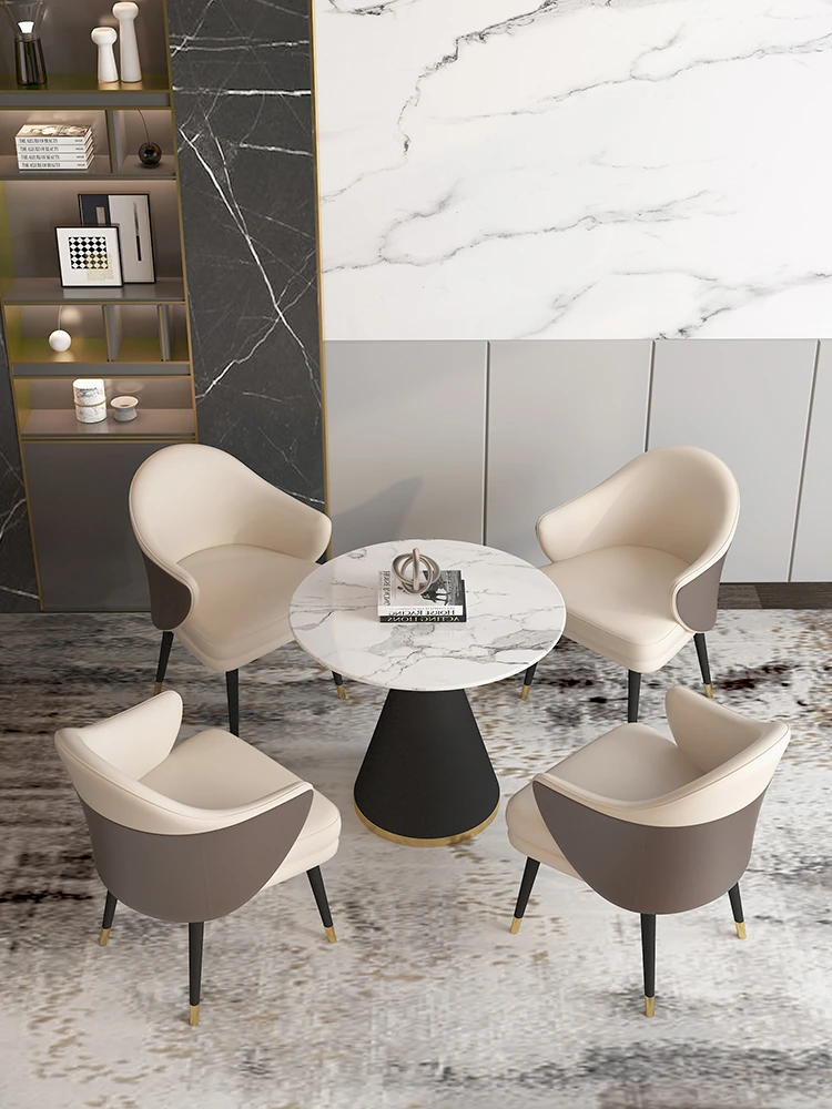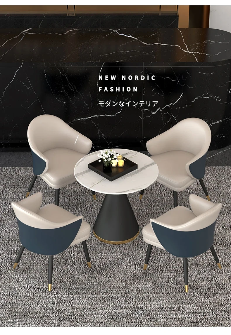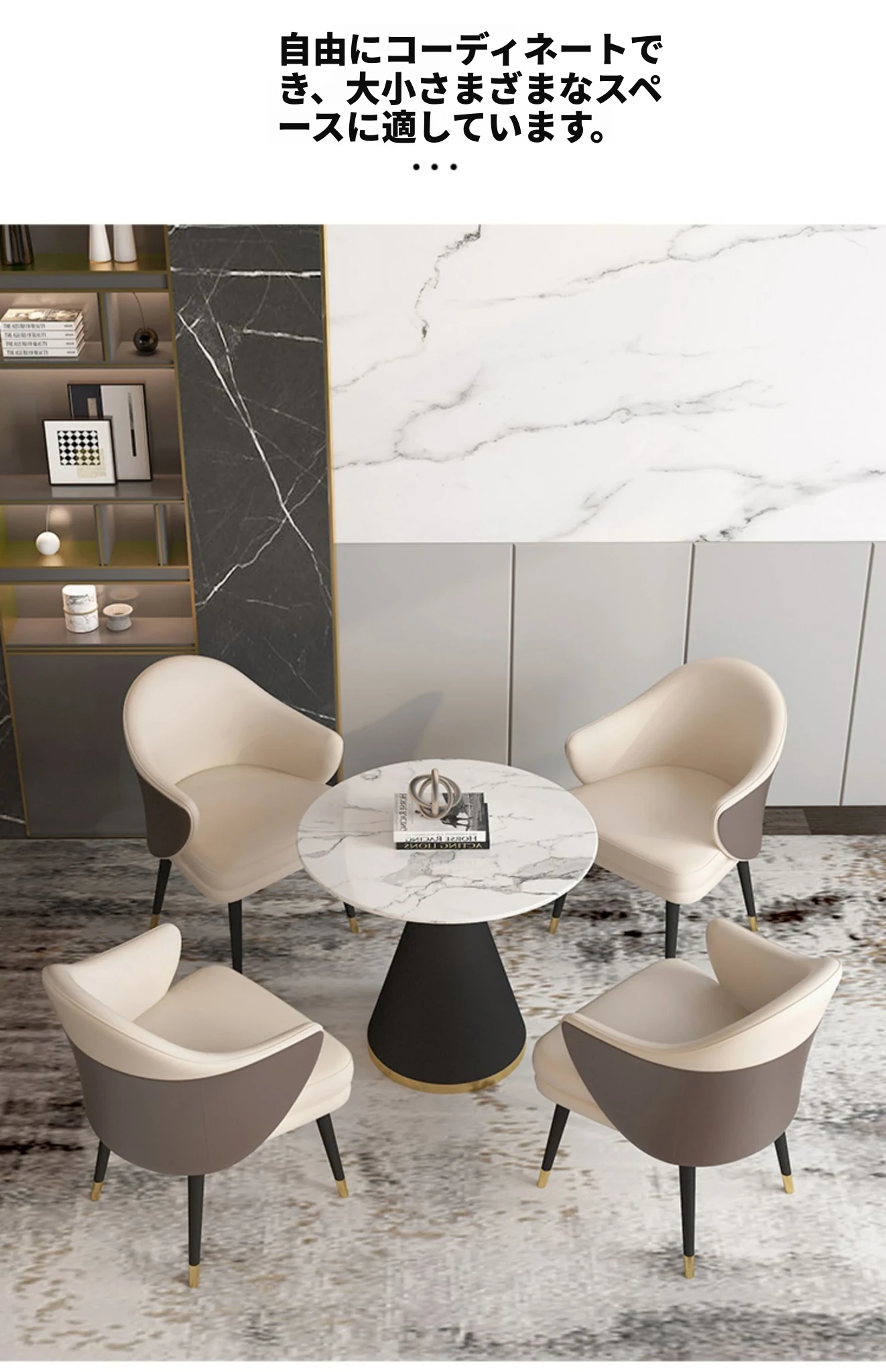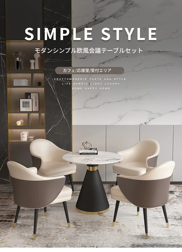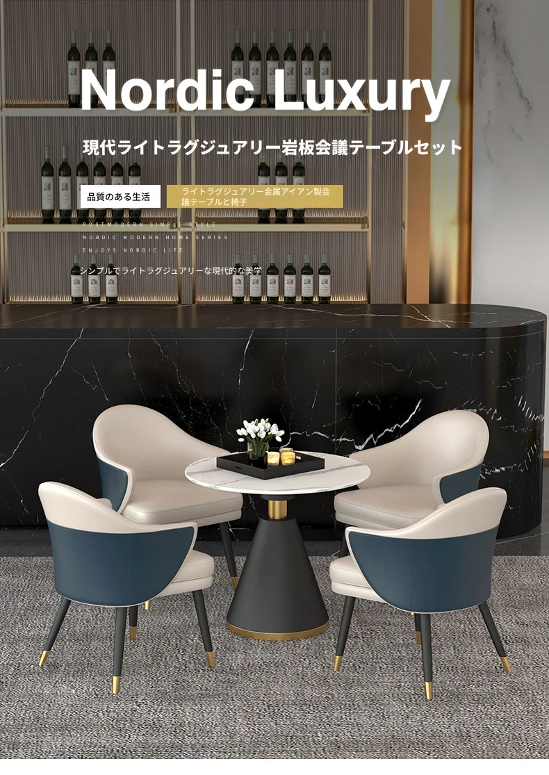 高級感溢れる不動産営業所用の談話テーブルセット!スタイリッシュな小型ラウンドテーブルと快適な4脚の椅子で、ビジネスミーティングや商談を華やかに演出。洗練されたデザインで、来客を心地よくお迎えします。