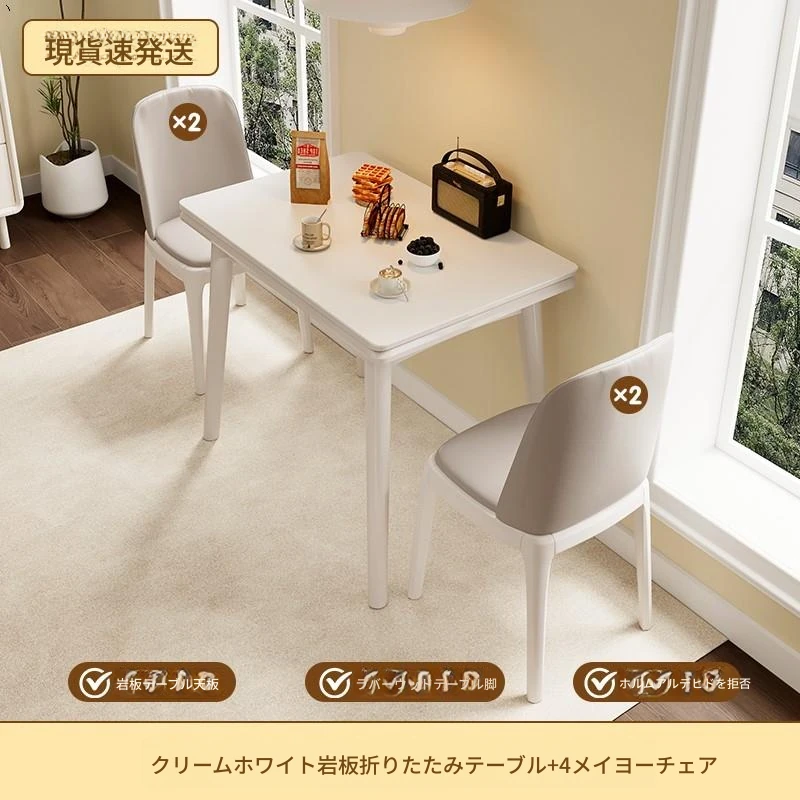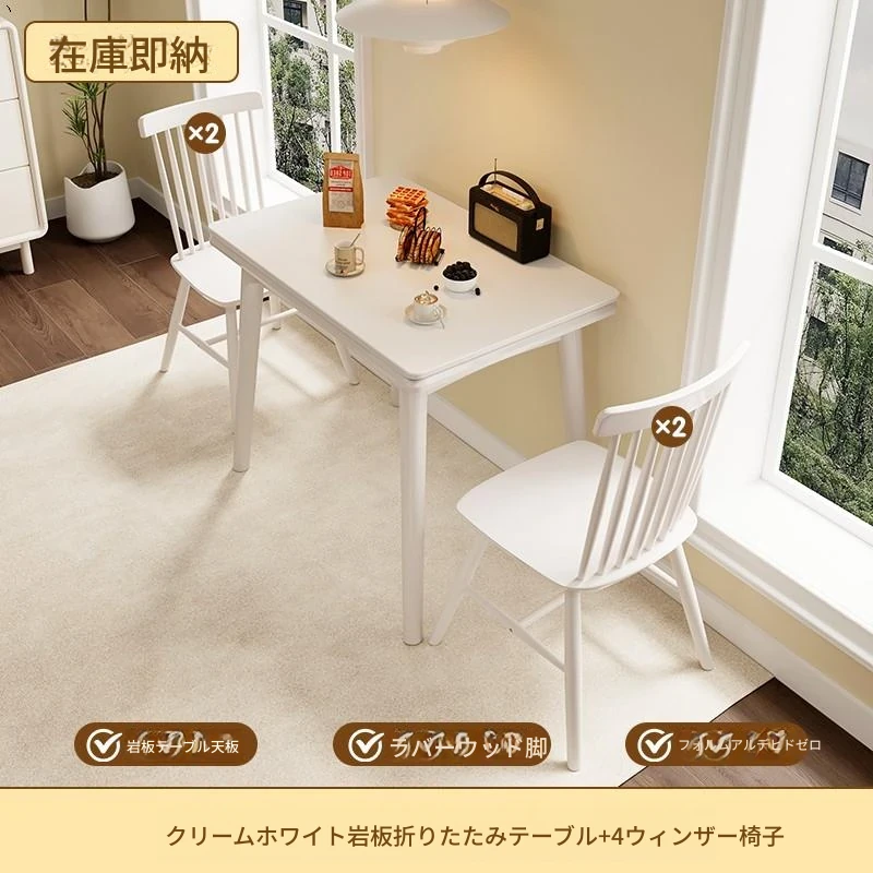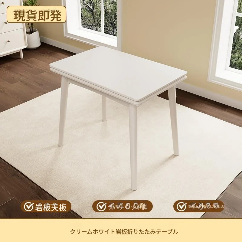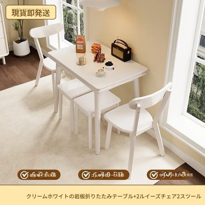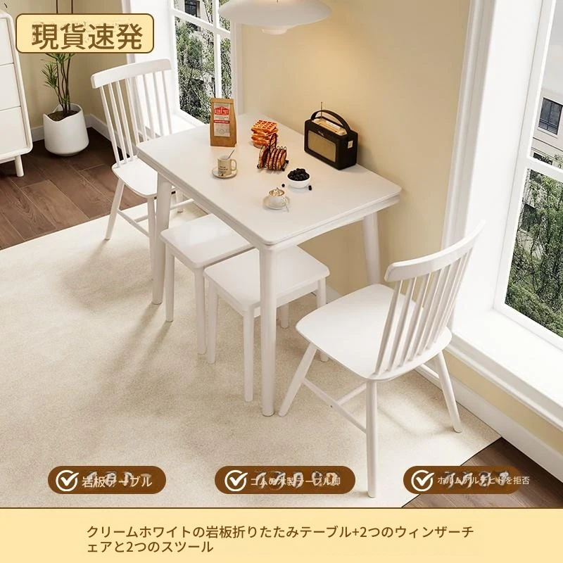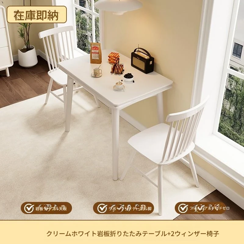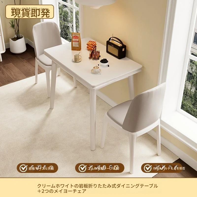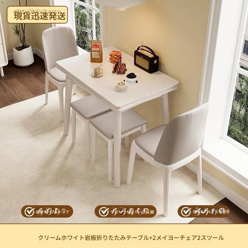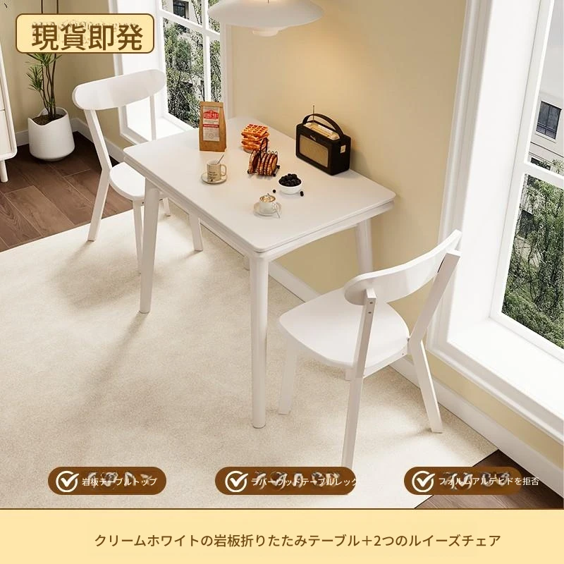 折りたたみ式の岩板ダイニングテーブル|小型住宅に最適な実木製・多機能・モダンシンプルな長方形ホワイトテーブル|省スペースでおしゃれな食事空間を演出!