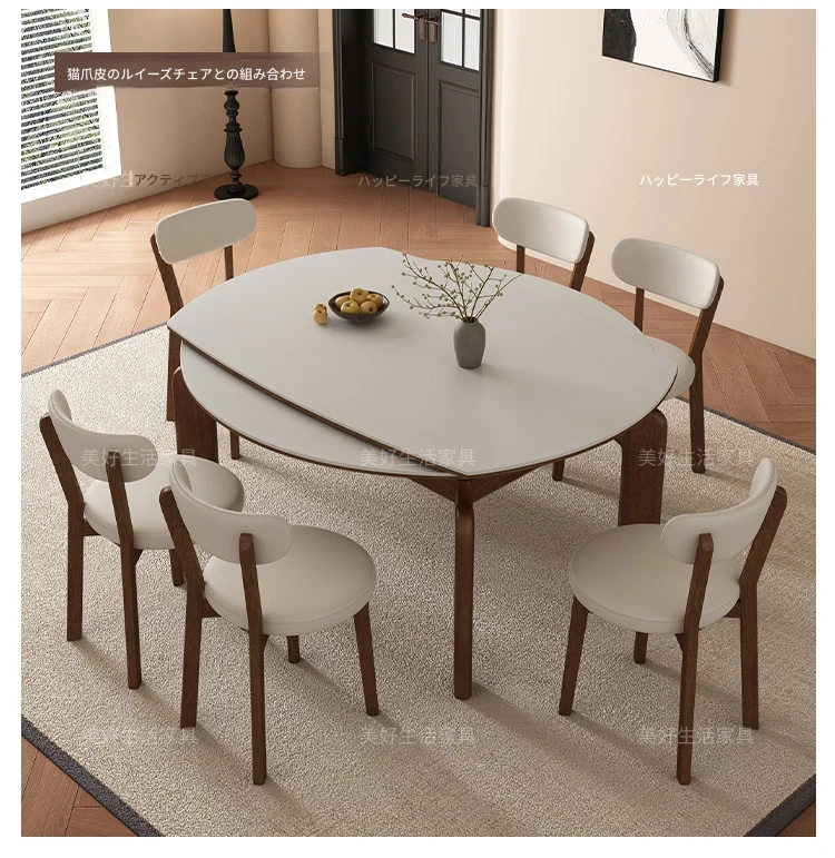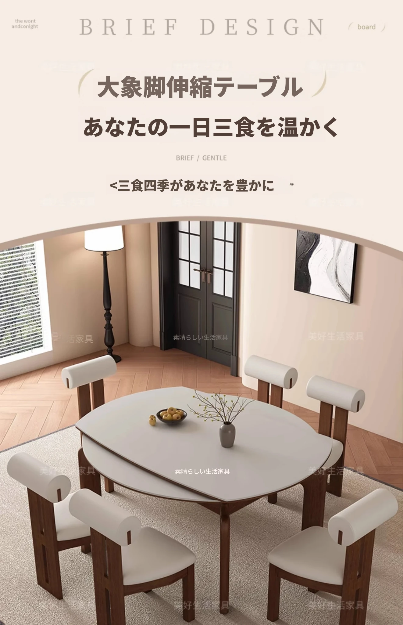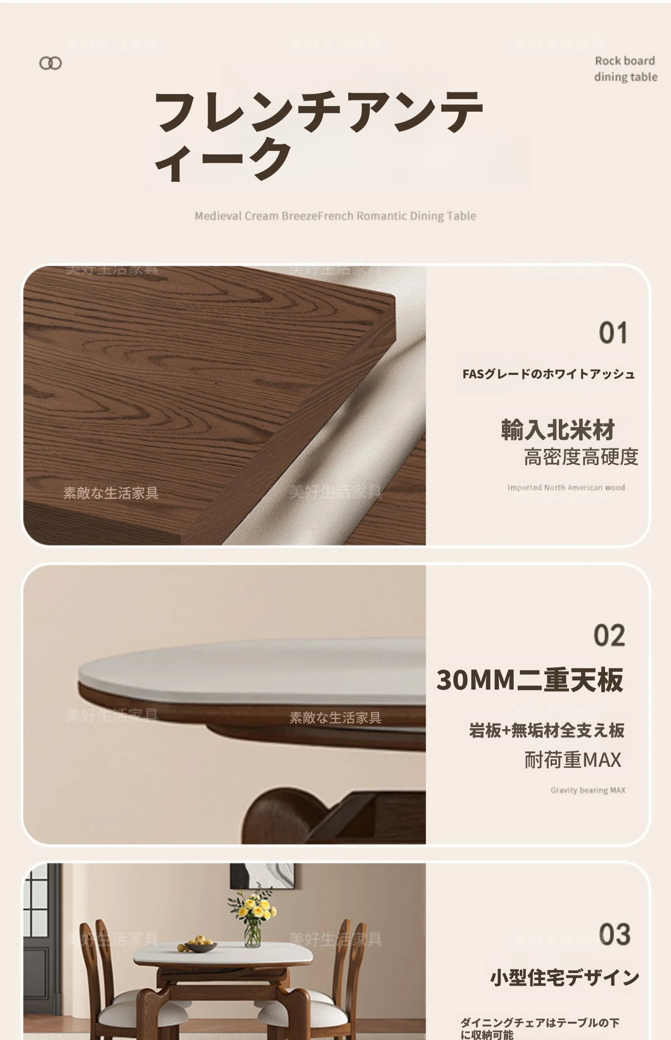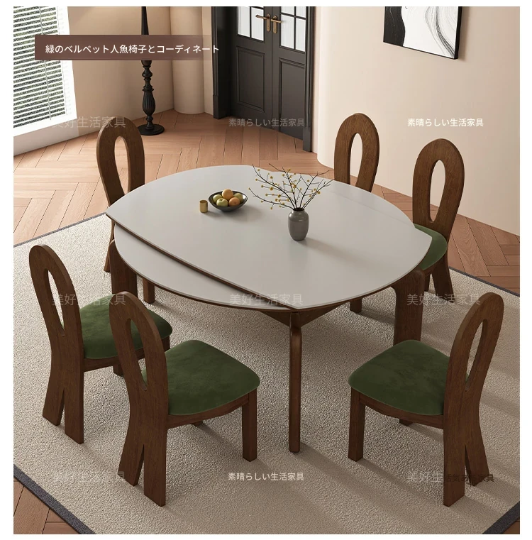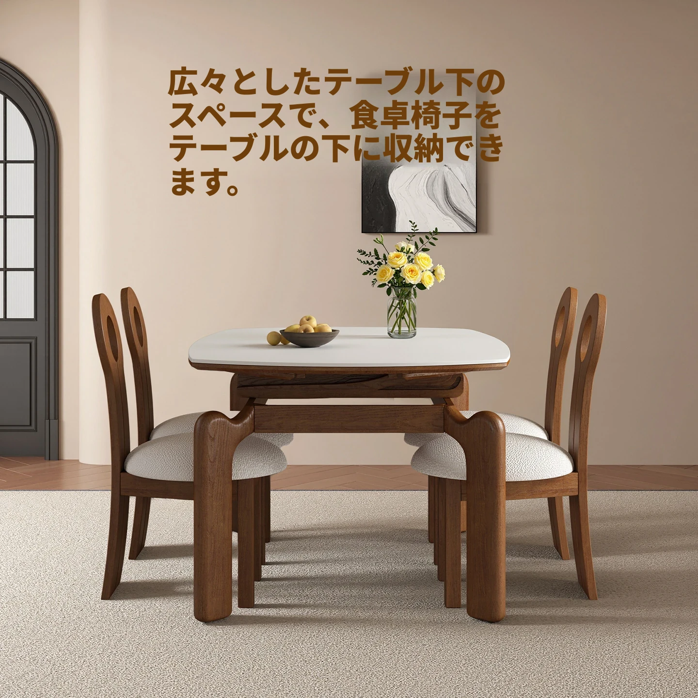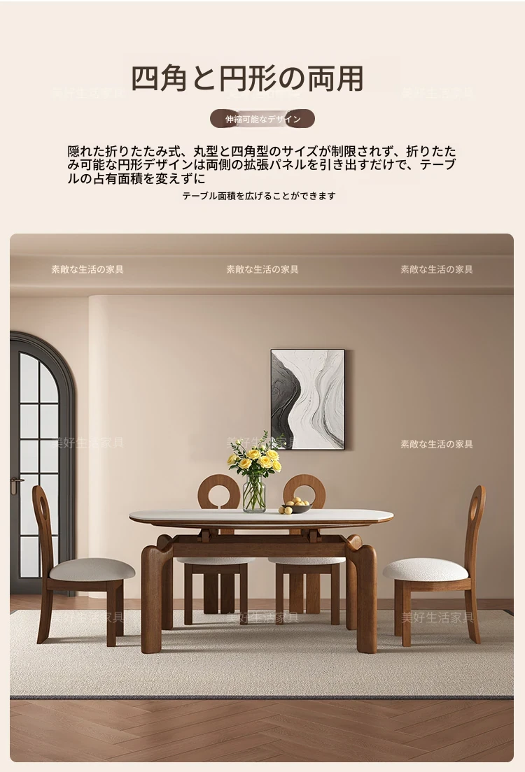 フレンチアンティークスタイルの無垢材ロックプレートダイニングテーブル - 小型住宅に最適!伸縮式で折りたたみ可能、円形と四角形の両方として使用できる多機能テーブル。おしゃれで便利な食卓を手に入れましょう!