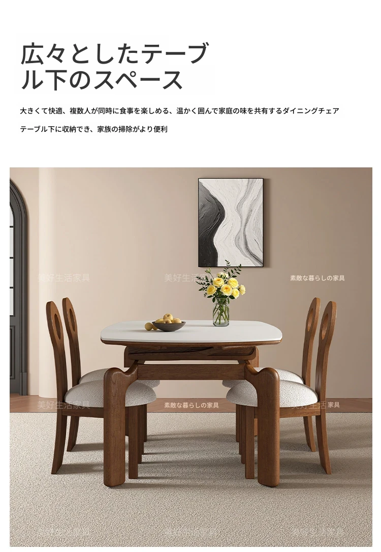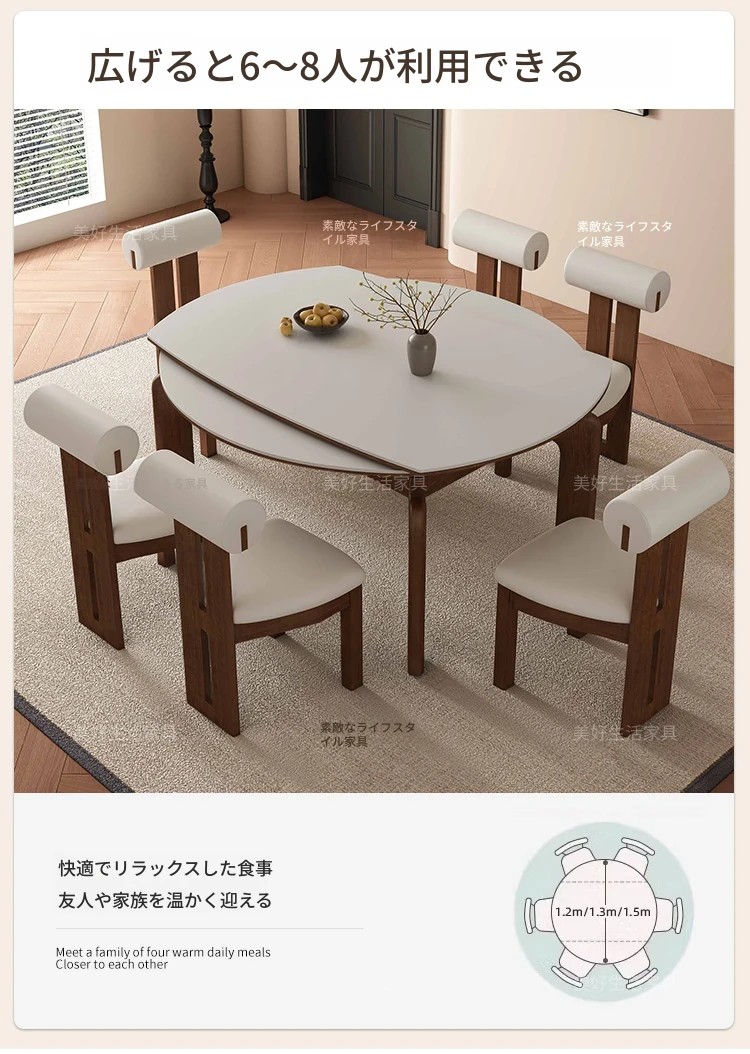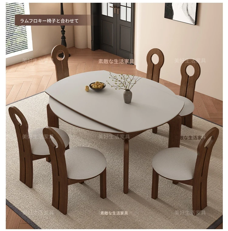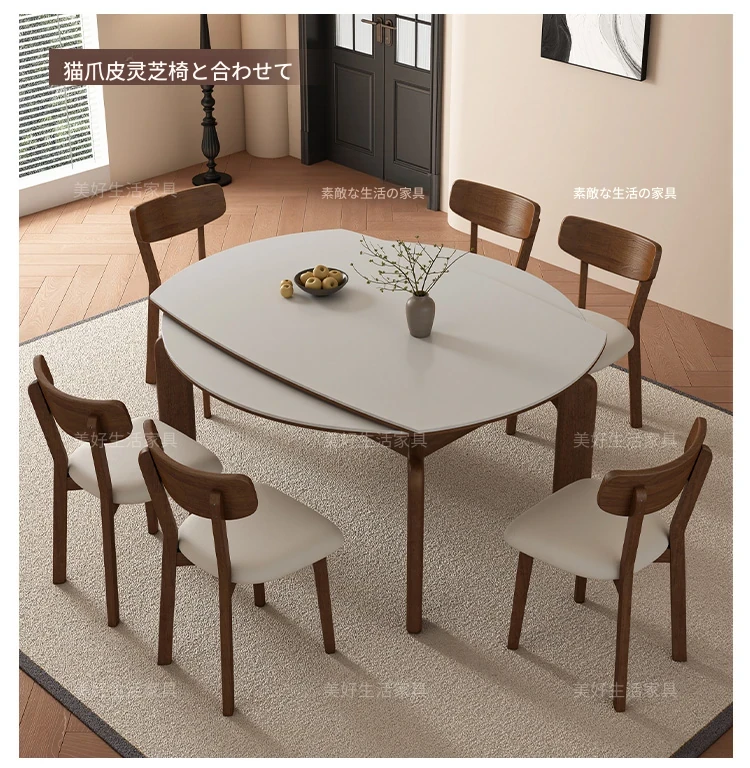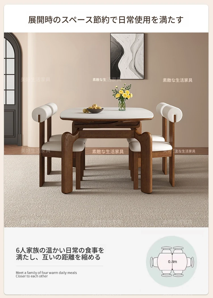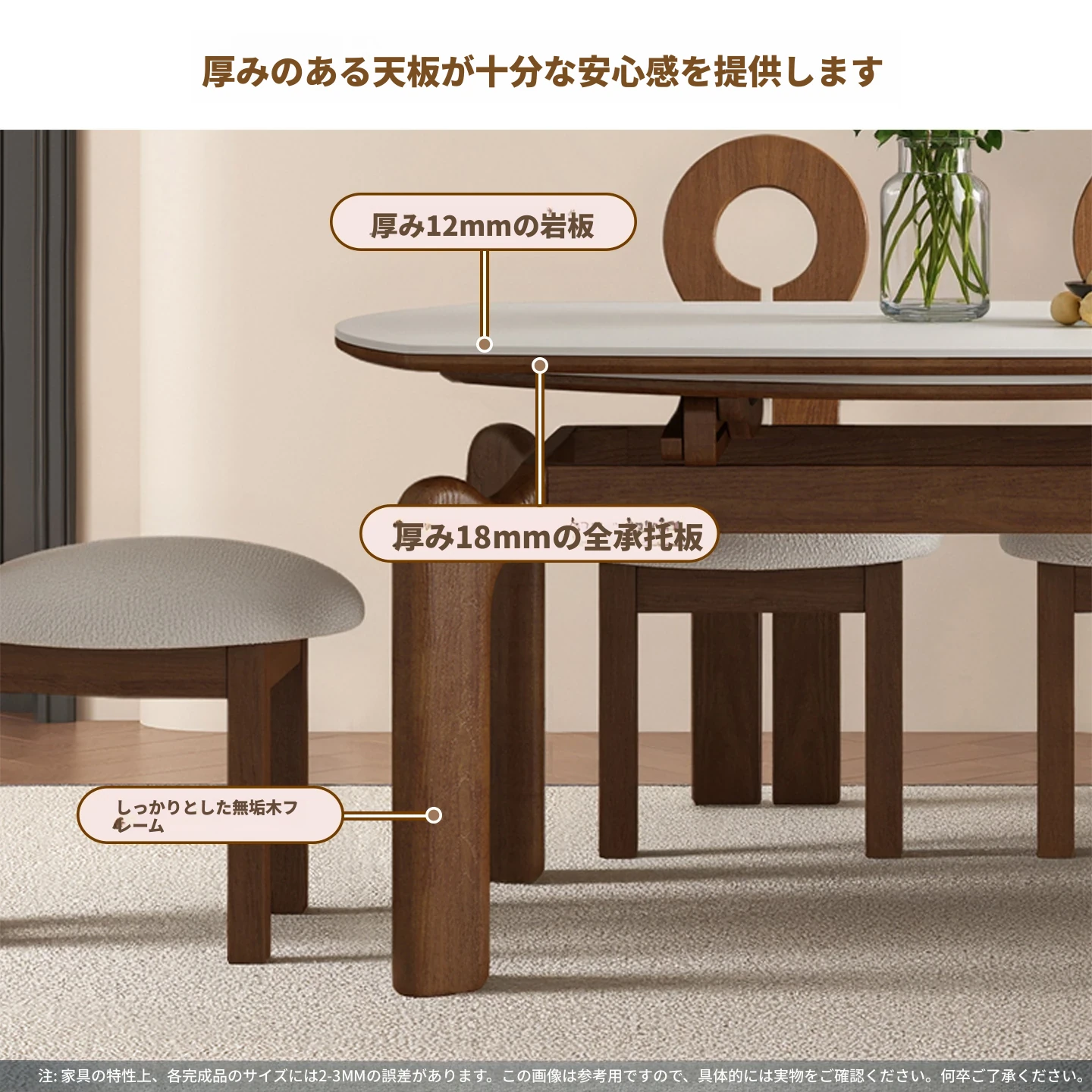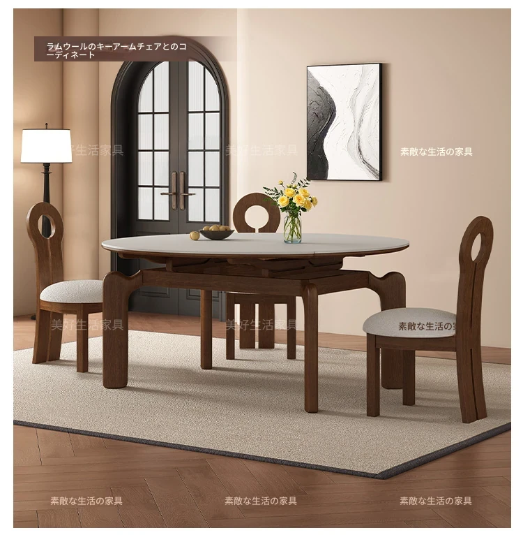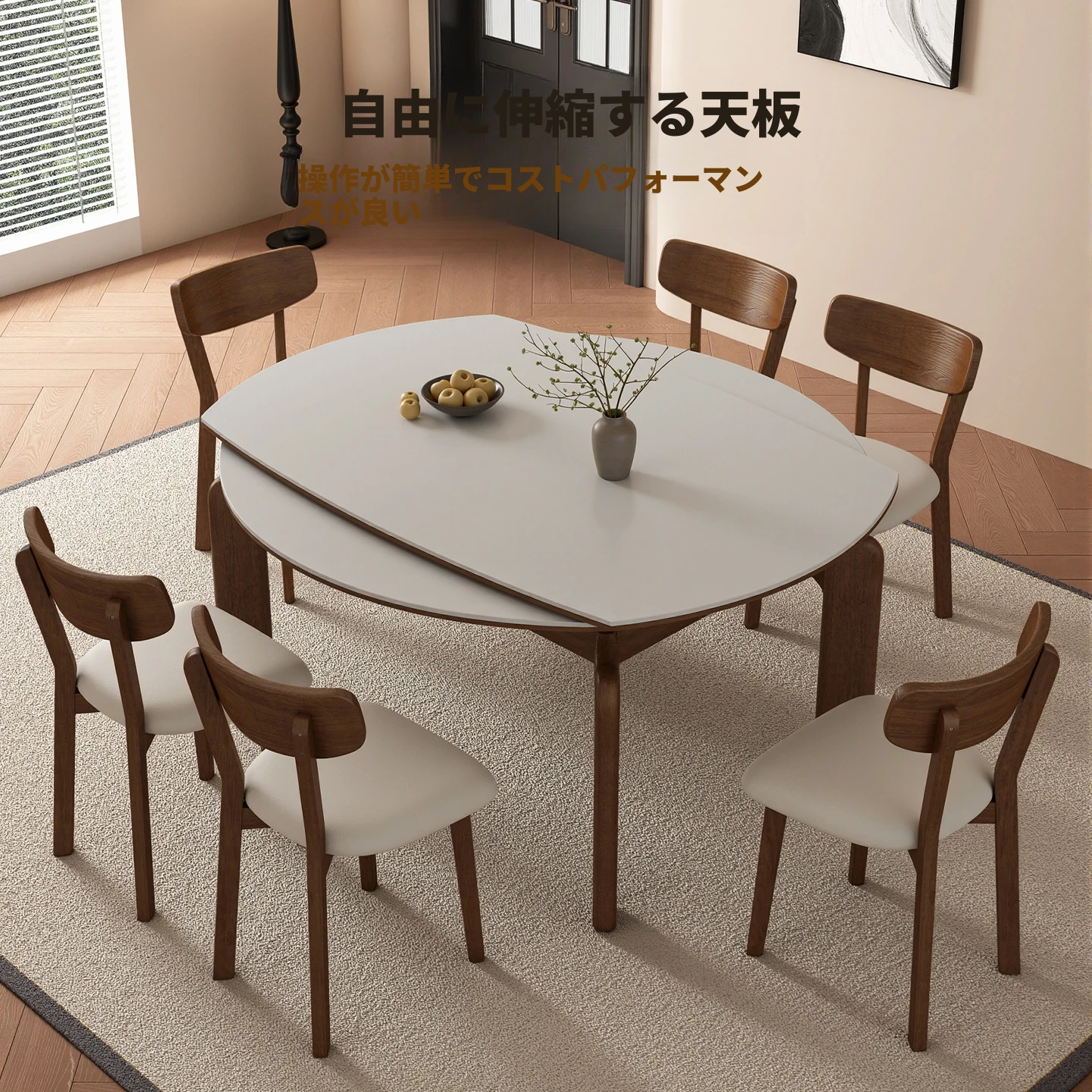 フレンチアンティークスタイルの無垢材ロックプレートダイニングテーブル - 小型住宅に最適!伸縮式で折りたたみ可能、円形と四角形の両方として使用できる多機能テーブル。おしゃれで便利な食卓を手に入れましょう!