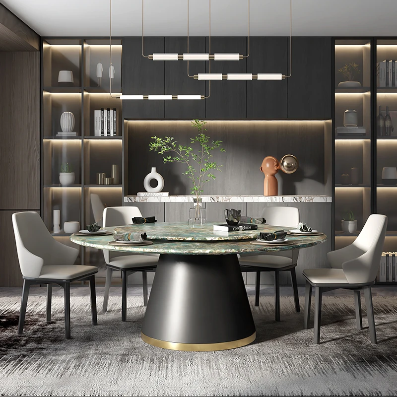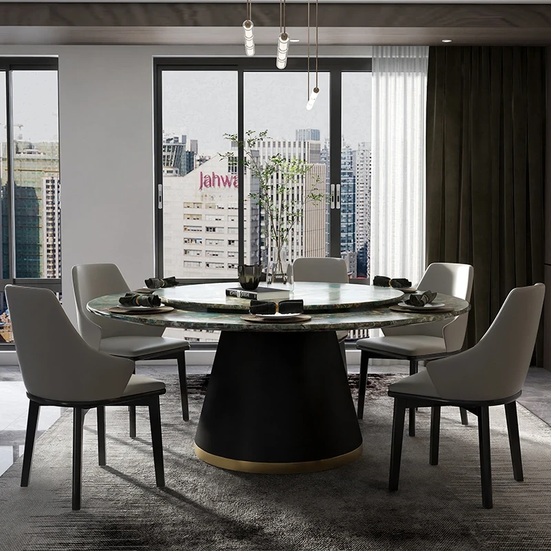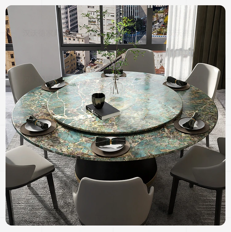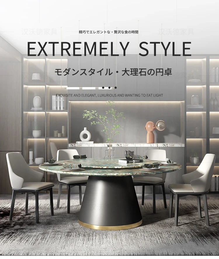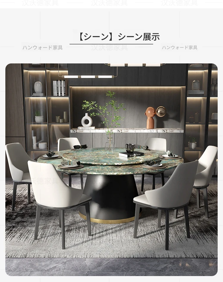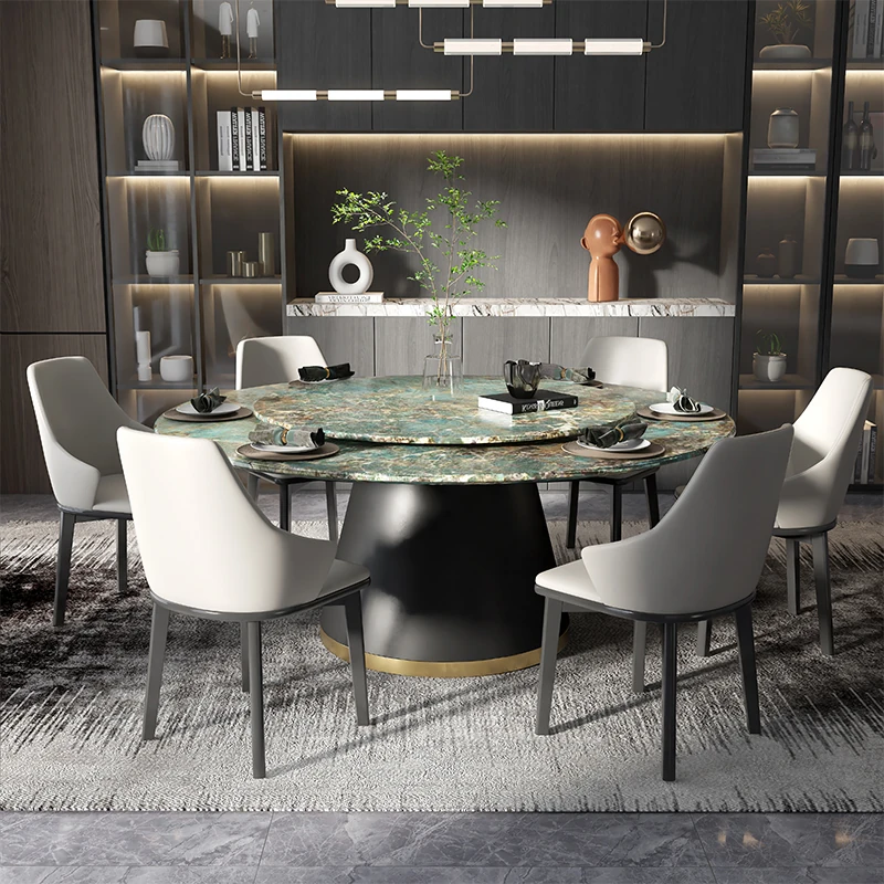 高級大理石円形ダイニングテーブル - 10人用電動回転式、贅沢なヴィラスタイルの食卓セット!家族や友人との特別なひとときを演出します。