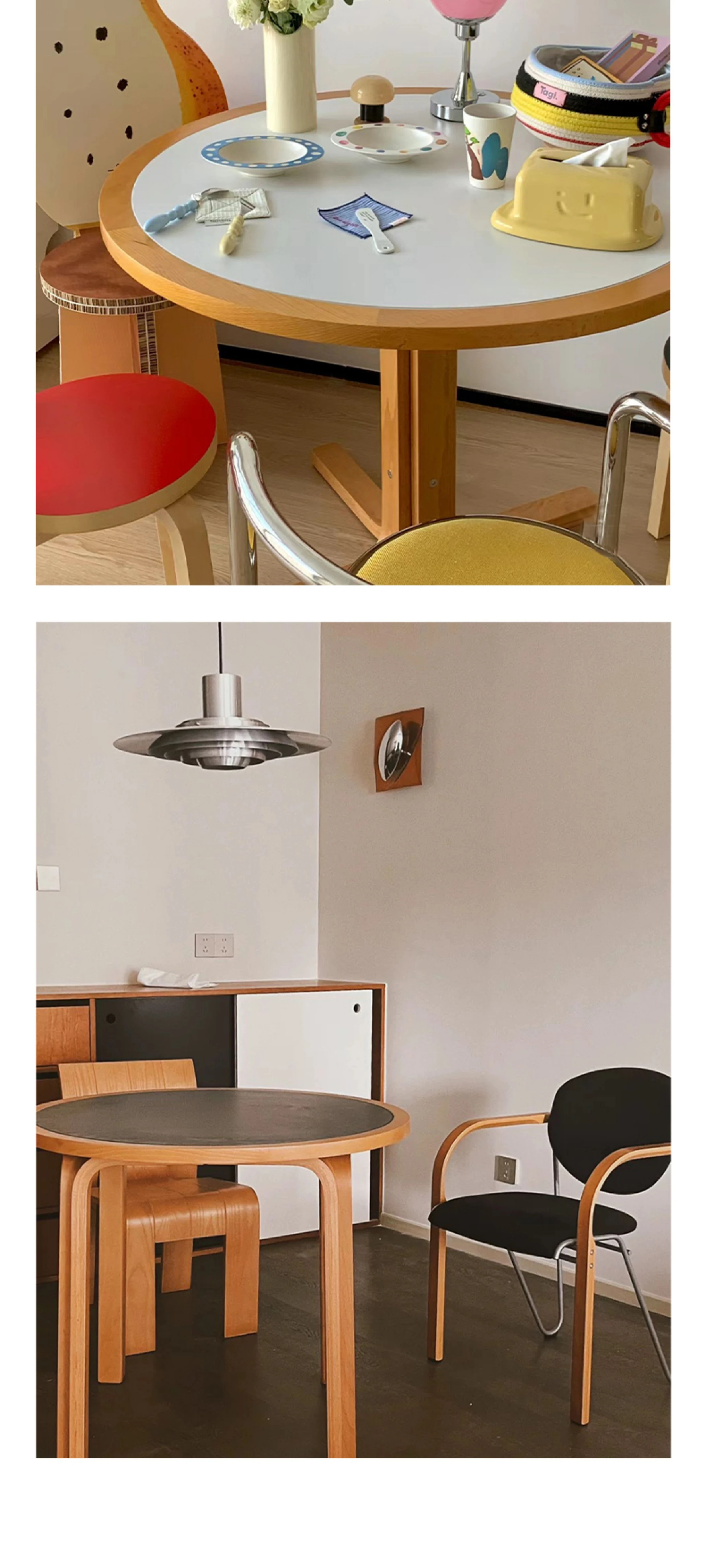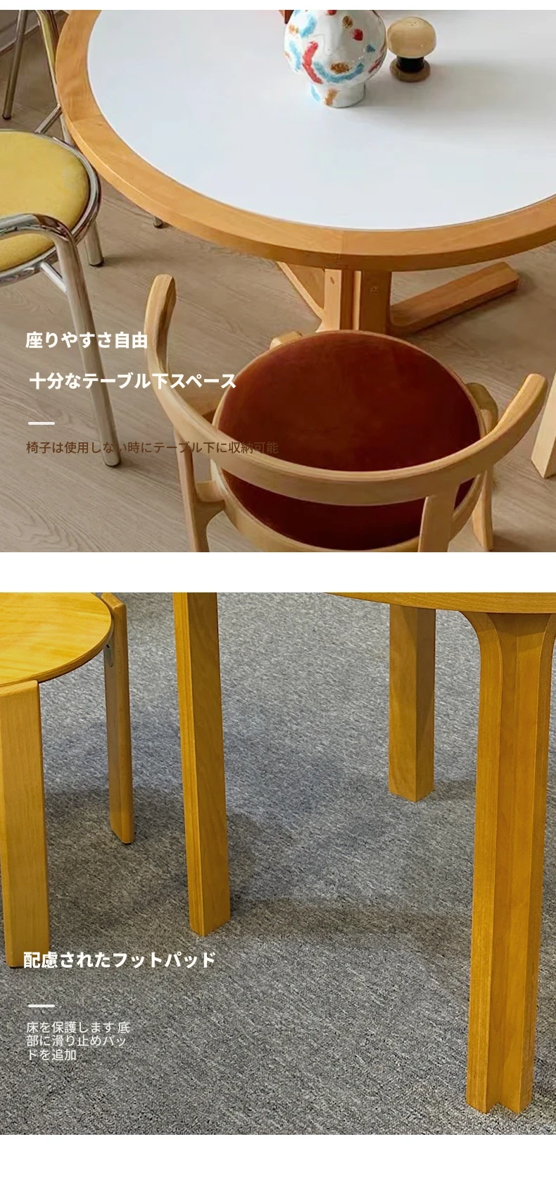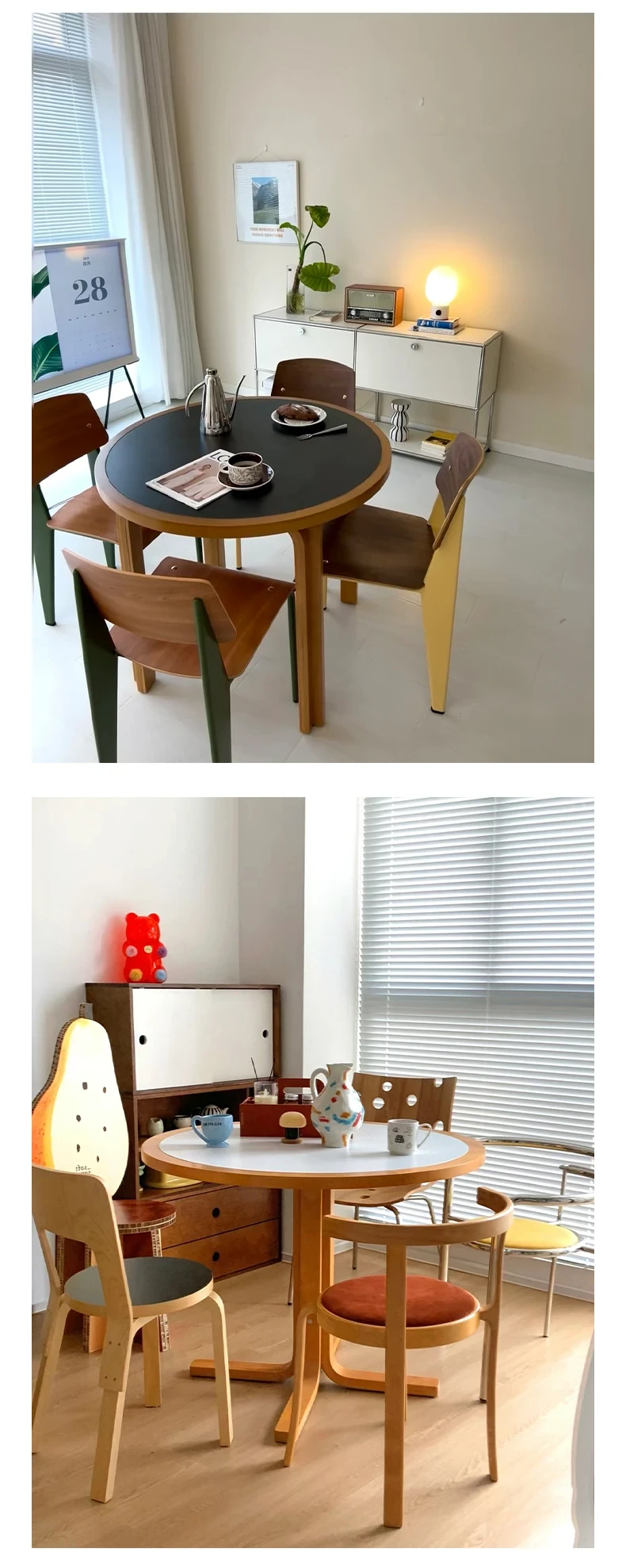 マカリュウビンテージ無垢材ロックボードダイニングテーブル|小スペースに最適!北欧スタイルの丸型テーブルとチェアセットで、心地よい食卓を演出します。