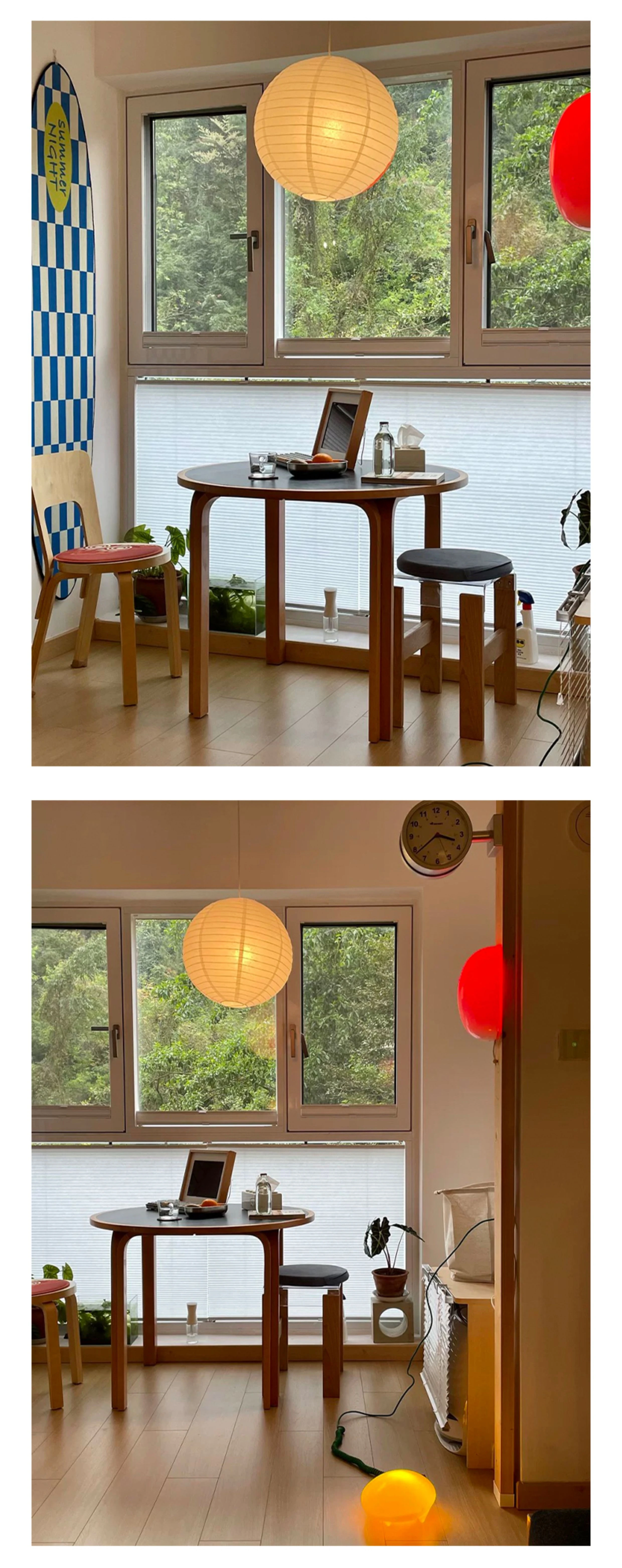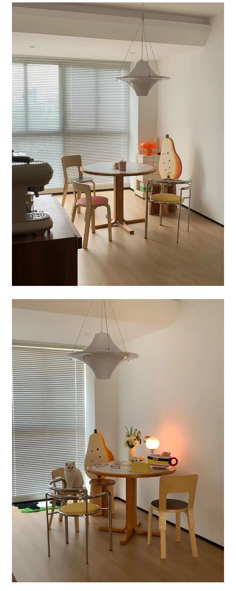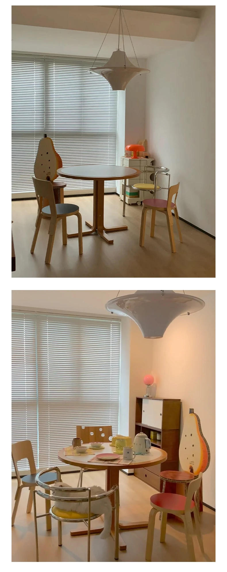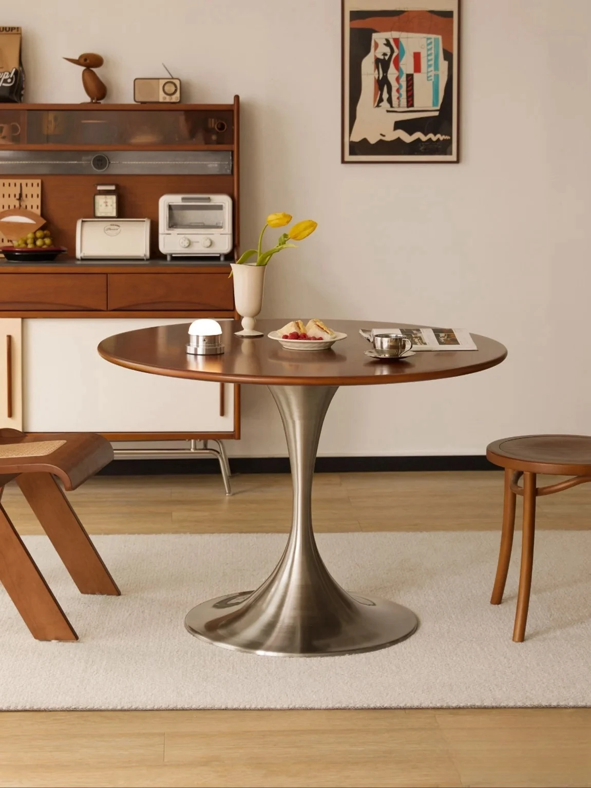 マカリュウビンテージ無垢材ロックボードダイニングテーブル|小スペースに最適!北欧スタイルの丸型テーブルとチェアセットで、心地よい食卓を演出します。