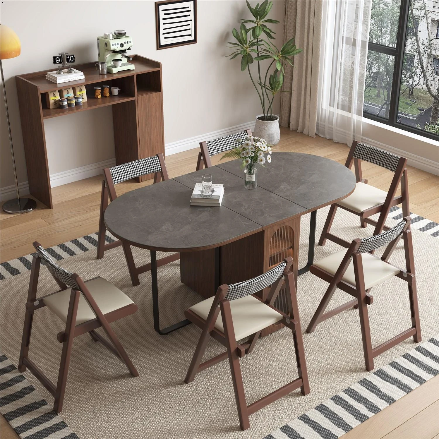 楕円形岩板無垢材ダイニングテーブル+4ウォールナット合金チェア+低いサイドボード