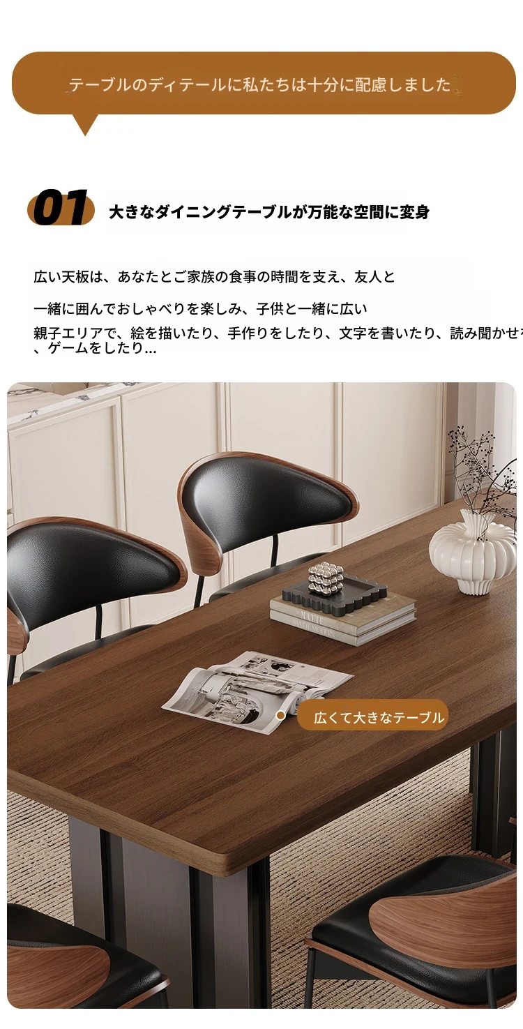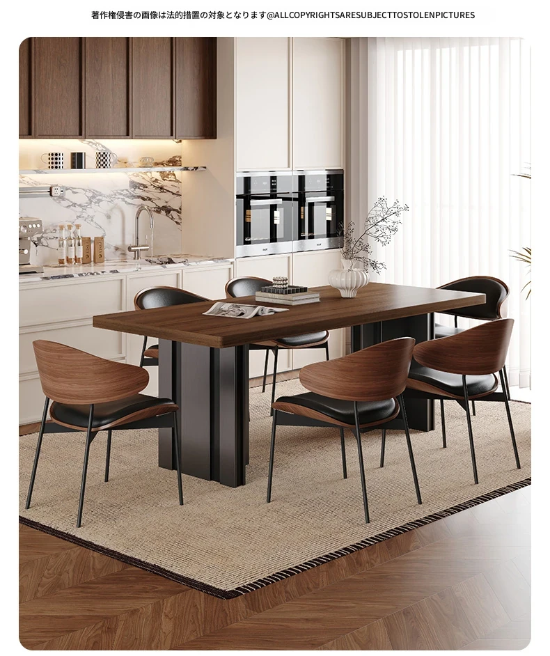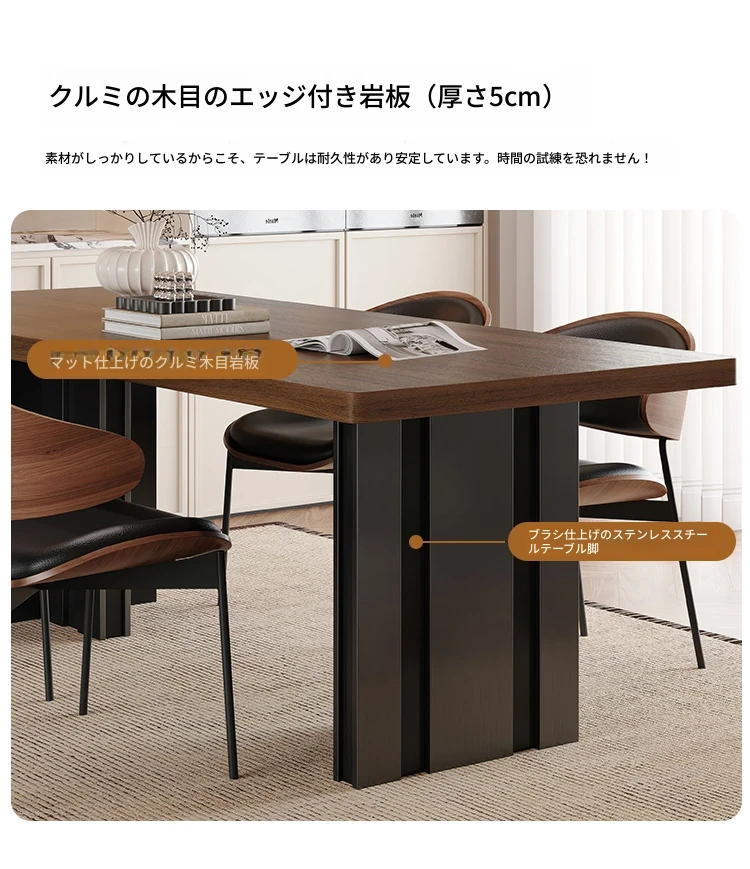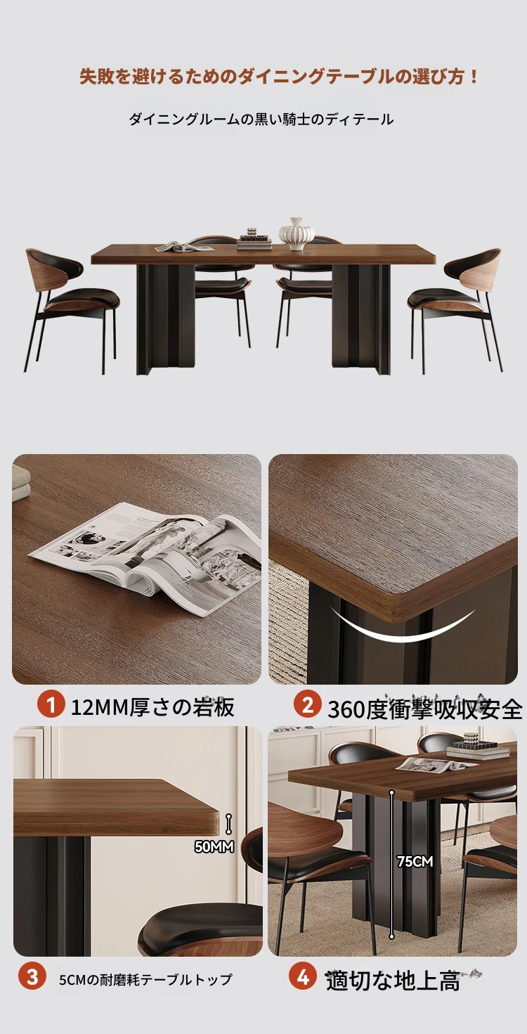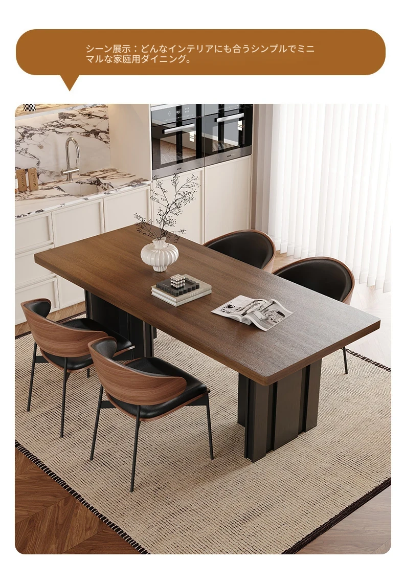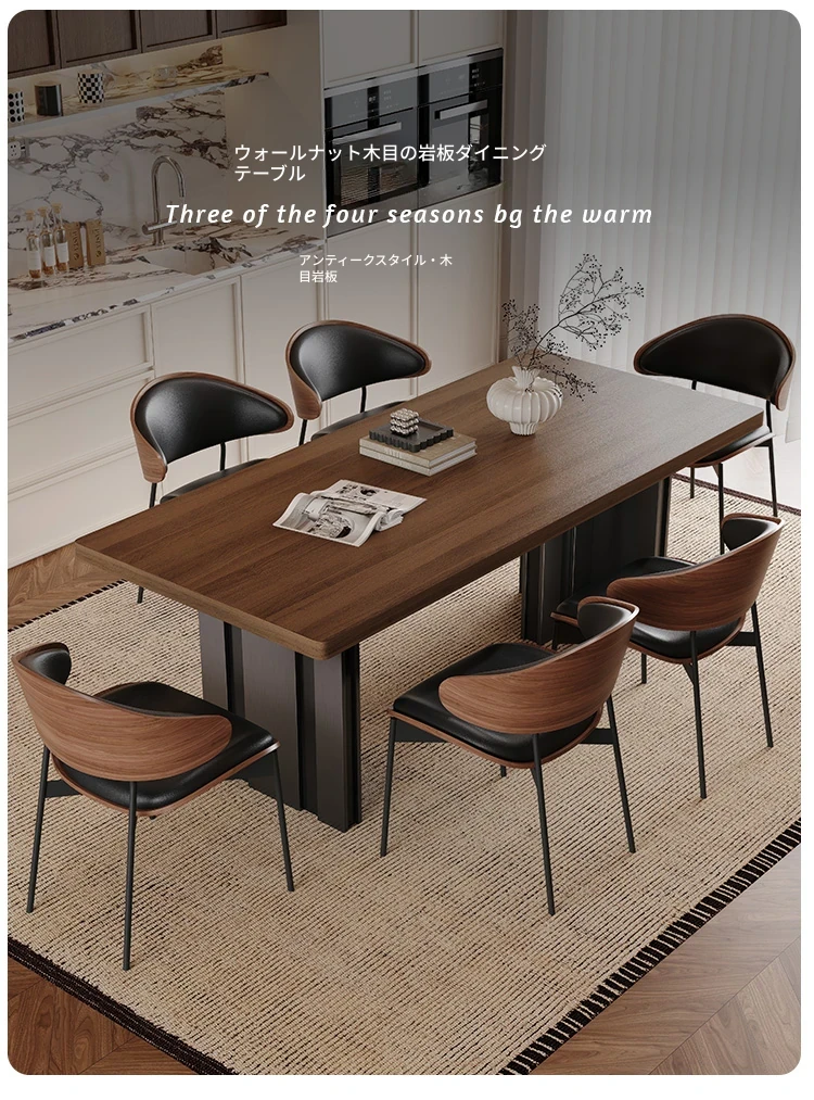 シンプルでモダンな侘寂スタイルのレトロな下掛けウォールナット色の厚手岩板ダイニングテーブルセット – 木目調の長方形デザインで、美しい食卓を演出!