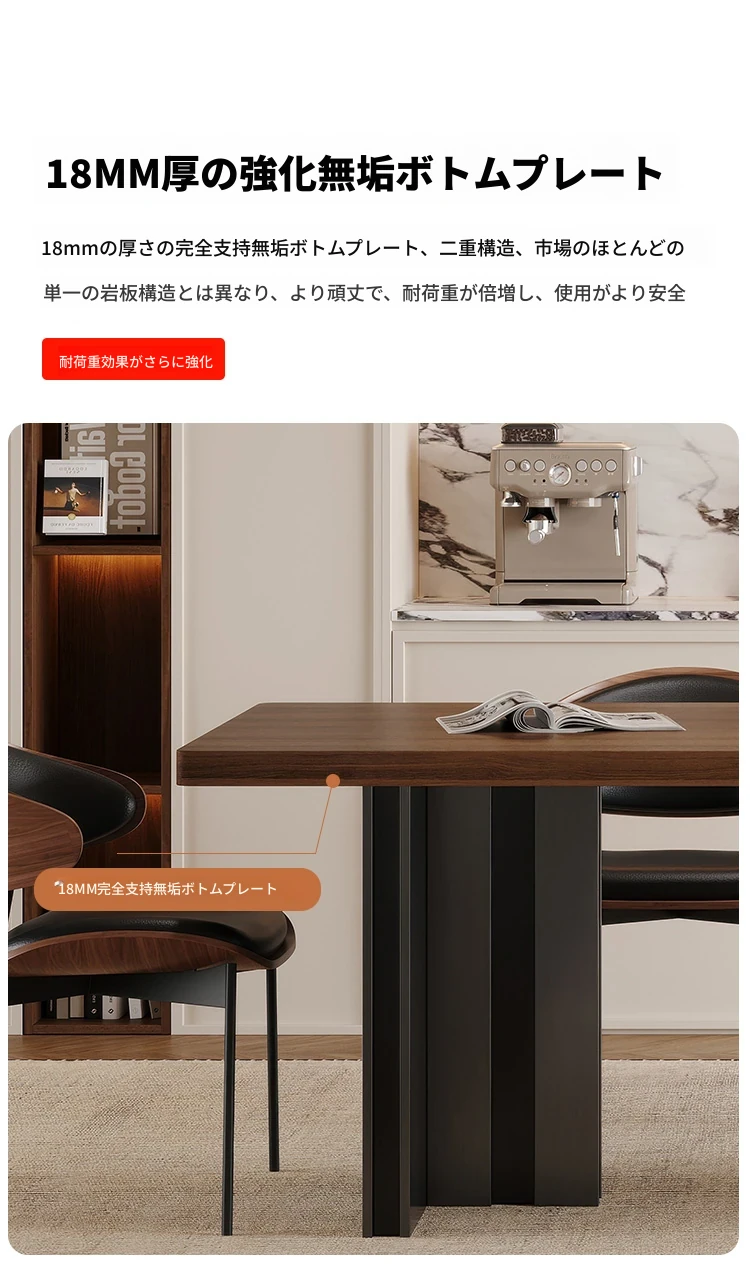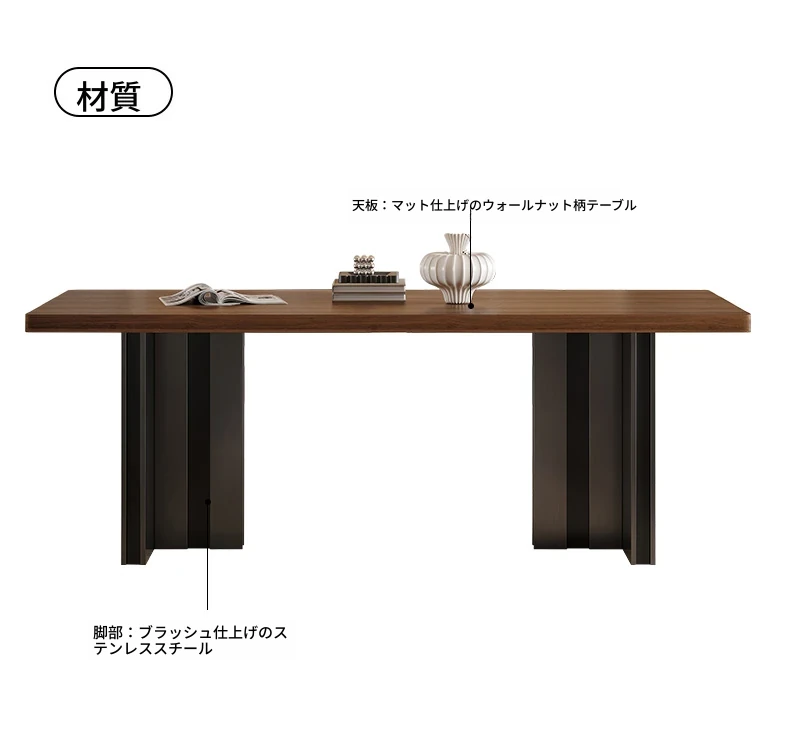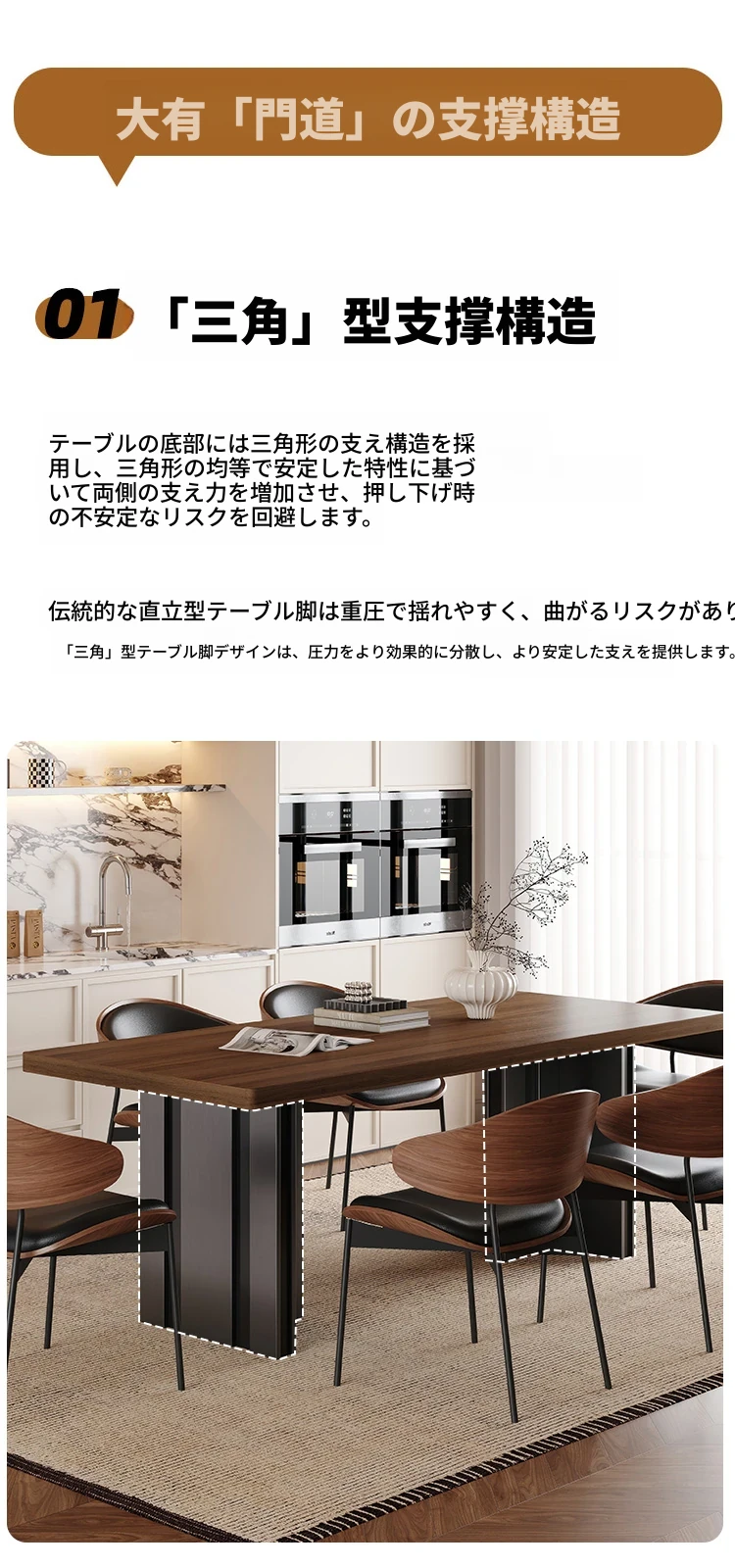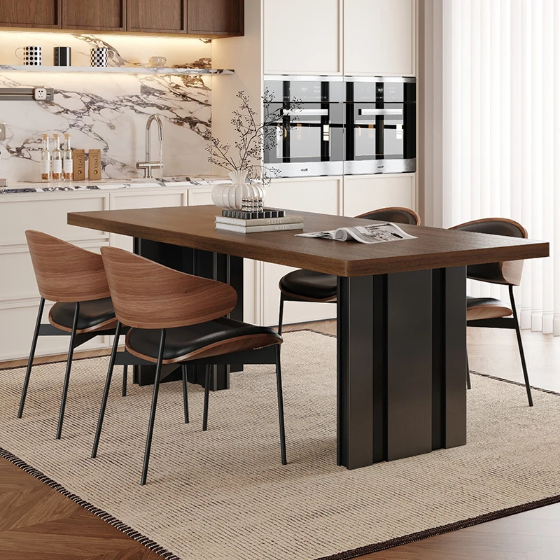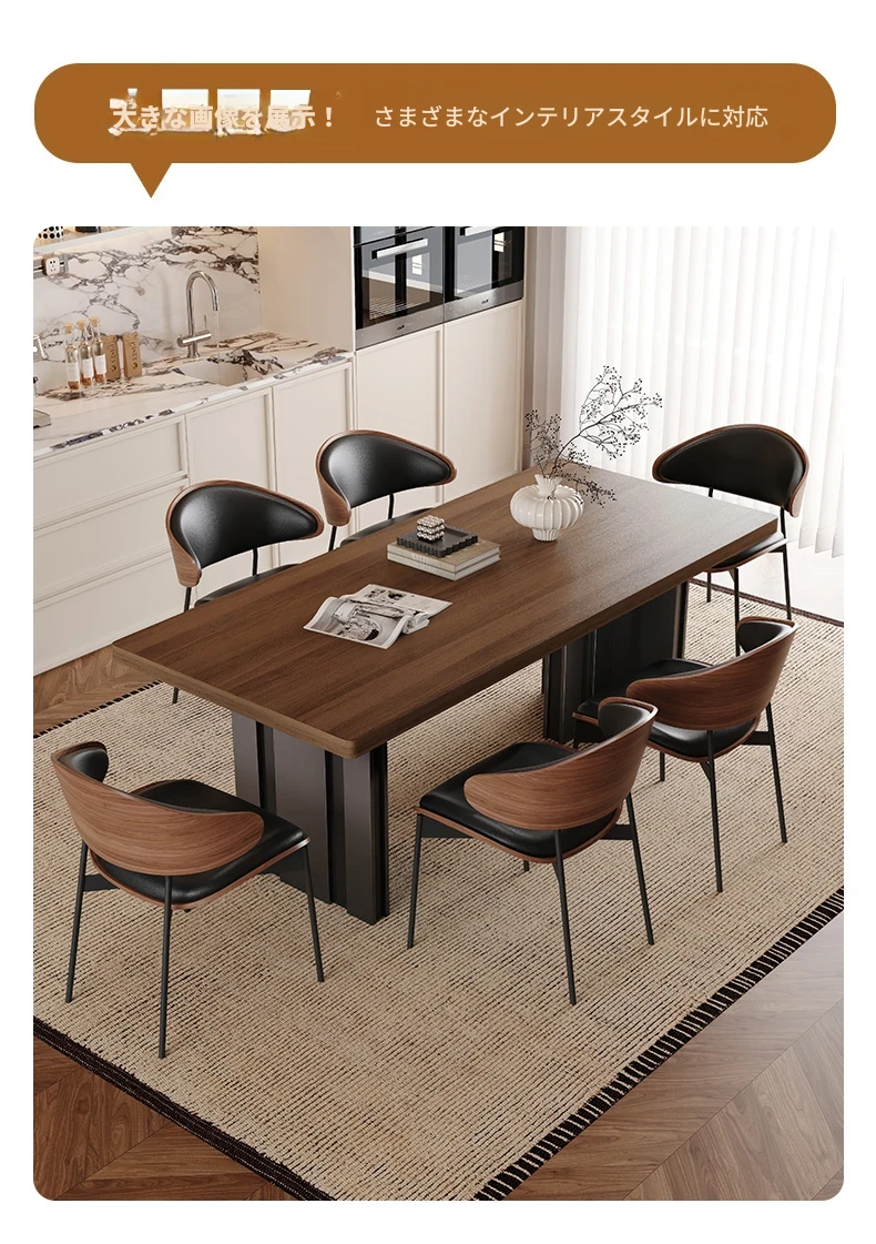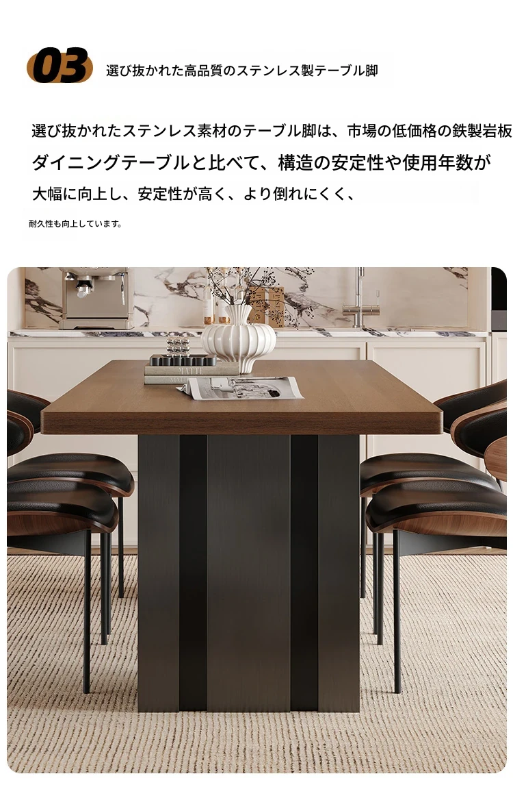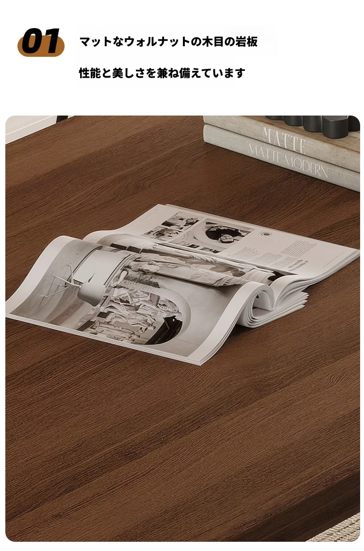 シンプルでモダンな侘寂スタイルのレトロな下掛けウォールナット色の厚手岩板ダイニングテーブルセット – 木目調の長方形デザインで、美しい食卓を演出!